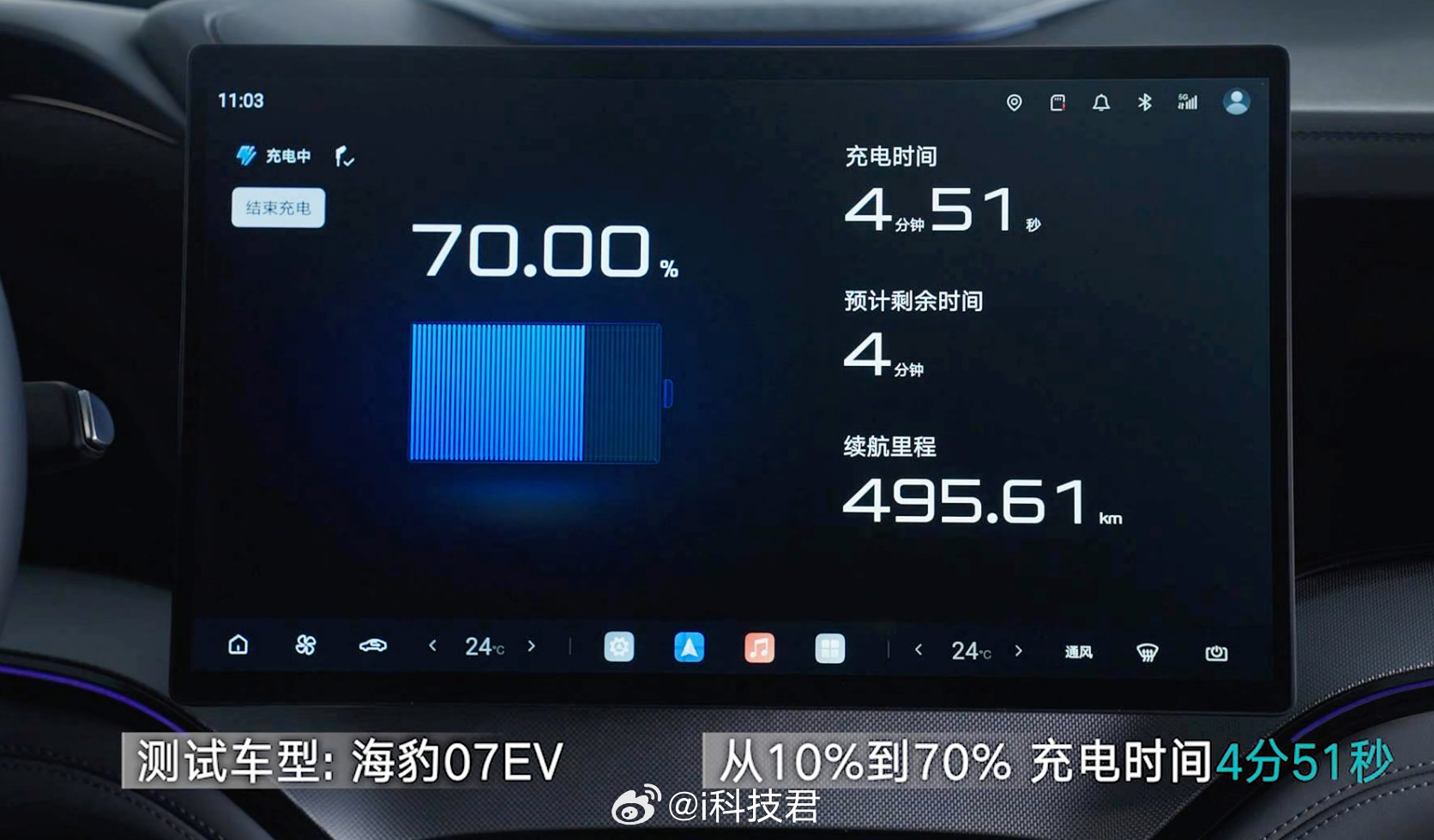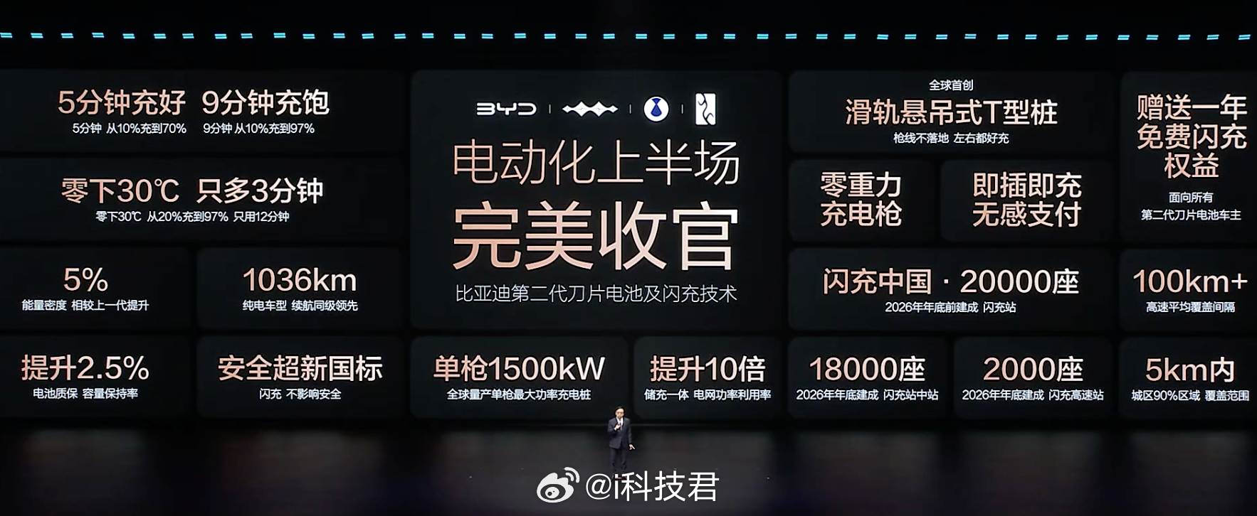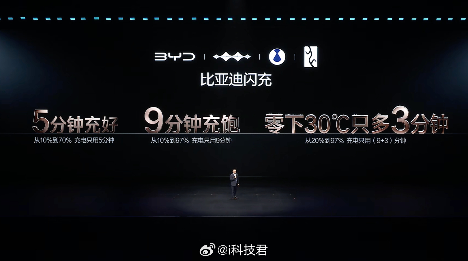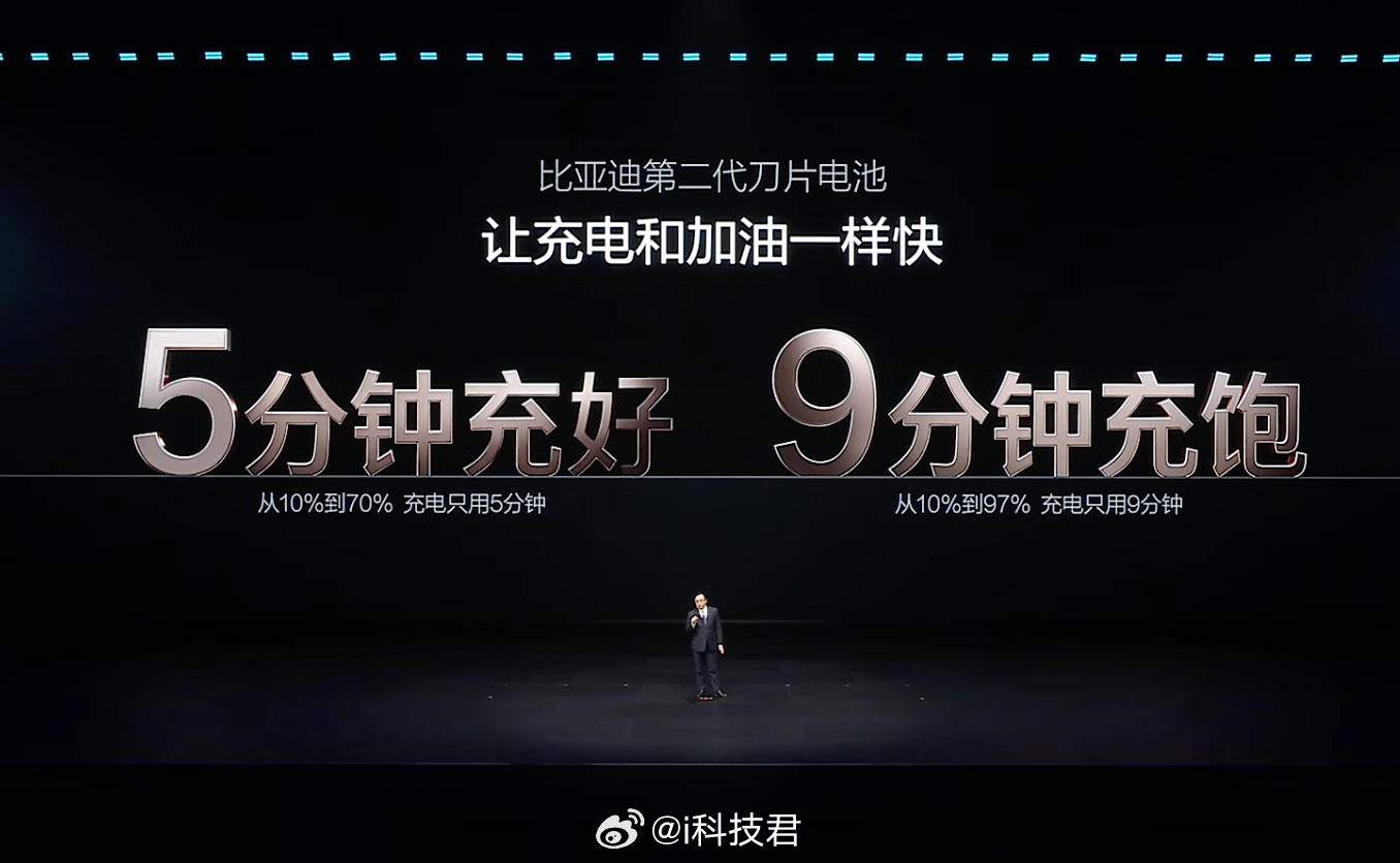 比亚迪今晚发布二代刀片及闪充 比亚迪发布第二代刀片电池10%到70%充电只用5分钟10%到97%充电只用9分钟5分钟充好,9分钟充零下20度充电,从20%到97%充电只用12分钟电池能量密度比第一代提升5%电芯终身保修+质保容量保持率整体提升2.5% 8年或15万公里电池容量低于72.5%免费包换安全测试超越新国标标准兼容市面约480万公共充电桩,不挑桩10款新车首搭第二代刀片电池