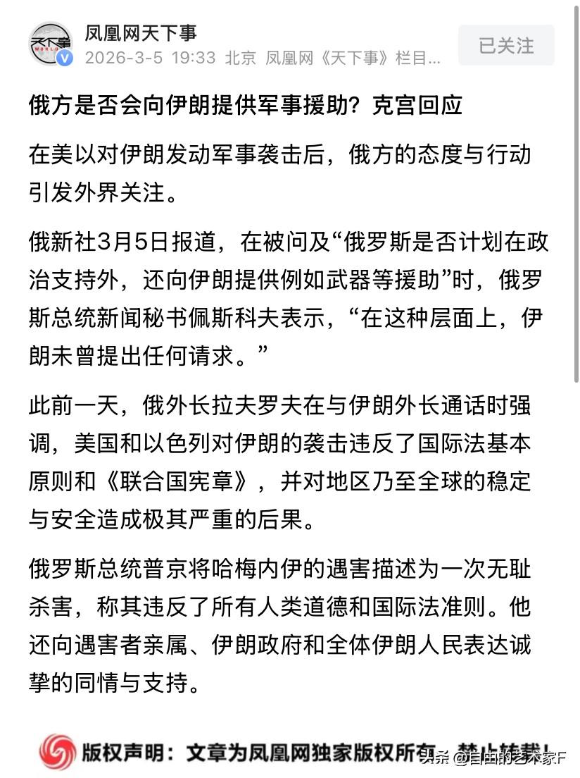 普京会向伊朗提供武器吗?俄罗斯:今天给出答案 美国以色列联手打击伊朗的行动,已经来到了第六天,在这期间虽然伊朗人也做出了反击,但是面对着美国和以色列铺天盖地的导弹轰炸,伊朗虽然也做出了反击,但是在弹药上双方有着明显的差距。 根据美国中央情报局给出的数据来看,伊朗最近导弹发射数据有了大幅度的下滑 第一天:伊朗发射了350枚导弹,和500架自杀式无人机 第二天:导弹数量降至175枚 第三天:导弹数量降至120枚 第四天:导弹数量降至50枚 美国方面给出的理由是,在无人机和红外线卫星的监控下,伊朗的导弹台一发射就会被捕捉到基准坐标,随后遭受到空袭。所以现在伊朗没有导弹发射台可用才导致发射数量逐日减少 不排除美国的这种说法,但更多的原因是,之所以导弹发射数量锐减,是因为伊朗在前四天需要大量的发射导弹,来攻击美军在中东的基地,破坏雷达和反导设施。 后期就进入精准射击和低袭扰,为长期战争做准备,所以导弹发射数量锐减 除此之外,有相关媒体询问了俄罗斯人,如果伊朗进入长期消耗战的话,美国是否会向伊朗提供武器还有援助 今天俄罗斯给出了正面回答,指出截止到现在,目前俄罗斯没有收到过伊朗方面提出的任何请求。 对于俄罗斯的回答,我们是怎么看的?标准的官方回答,即回答了问题,也向美国和以色列传达了伊朗武器充足,已经做好了把长期战的意思。同时这个模糊的回答还可以引发外界的联想,让在这个问题上不主动的俄罗斯,立场会转变为主动,甚至于还会拿着这一个问题当作和美国就无可谈判的筹码来使用