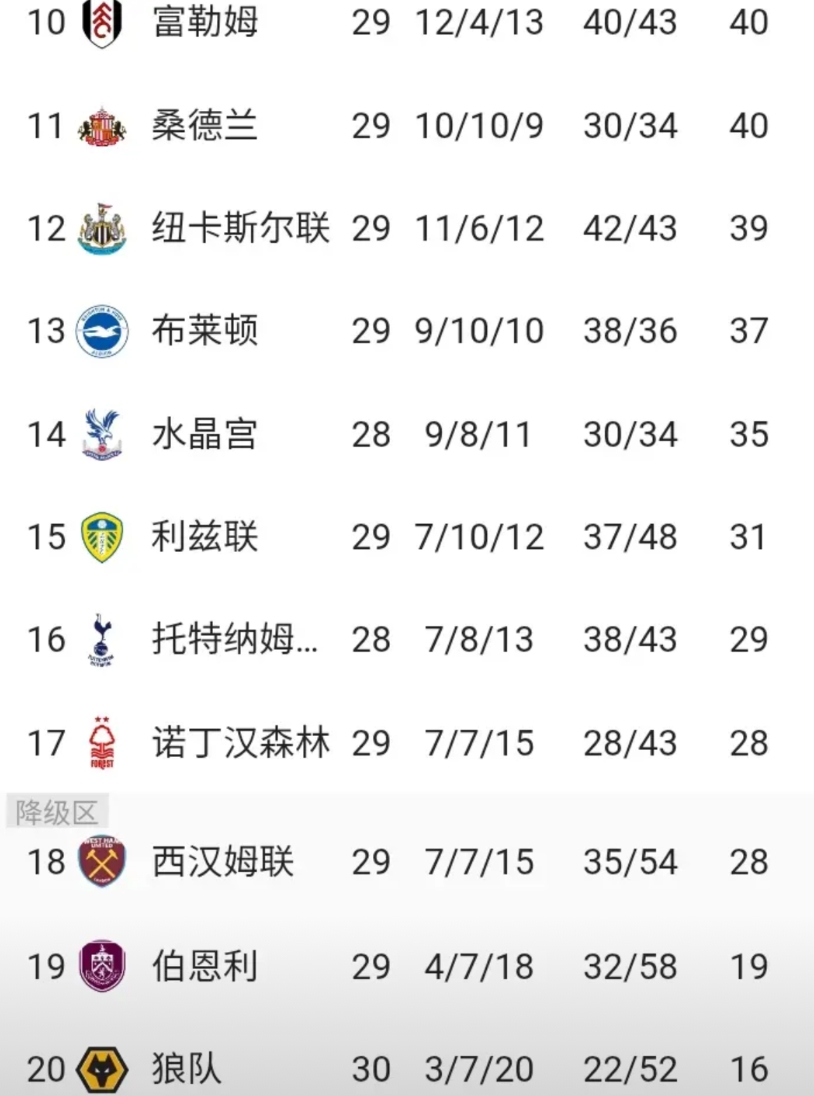 英超周中快车,争冠球队纷纷刹车,只有领头羊阿森纳依然保持在线,多赛一轮已领先曼城7分,半只手已经摸到冠军奖杯,如果这样还掉链子,那就太让球迷失望了,最让人瞩目的焦点已转移到欧冠名额之争,曼联,维拉,切尔西,利物浦,四选三,一场球队差距,刺激,而保级区这轮纷纷揭竿而起,狼队后面要是能拿下7场胜利,居然还能保级,热刺这俩赛季不知道是凯恩和孙兴慜离开之后,后遗症现在慢慢显现了出来,别说争个欧联名额,现在能不能保级都不好说了,英超,真是太有剧情太有节目了。