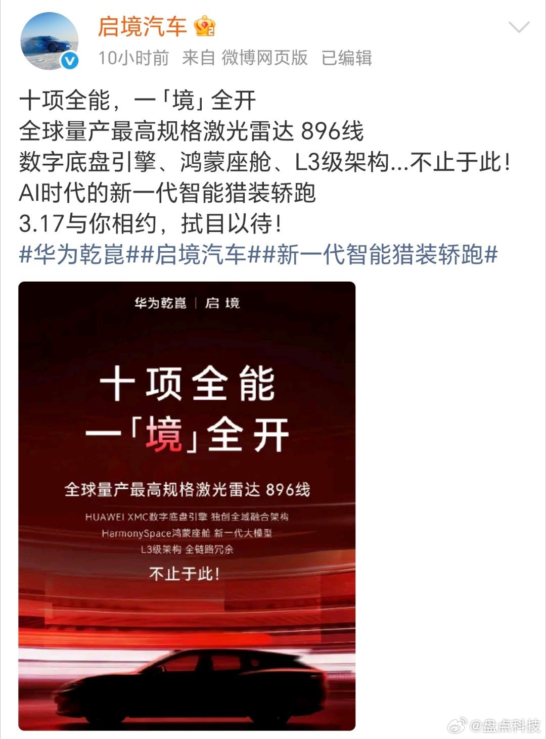 3月4日鸿蒙智行技术焕新发布会重磅发布,尊界 S800全球首发搭载华为乾崑新一代896线激光雷达,一举刷新量产车载感知性能天花板。值得注意的是,此次技术浪潮不仅席卷鸿蒙智行家族,广汽集团与华为乾崑的启境汽车也确认将同步搭载尊界同款896线雷达及多项同源硬核技术!作为华系首款智能猎装轿跑,启境新车已正式定档3月17日发布会亮相。从百万级旗舰到新生代智能猎装轿跑,这波“技术同源”操作,你看好吗?启境首款猎装轿跑或命名7系列华系首款猎装轿跑启境即将亮相