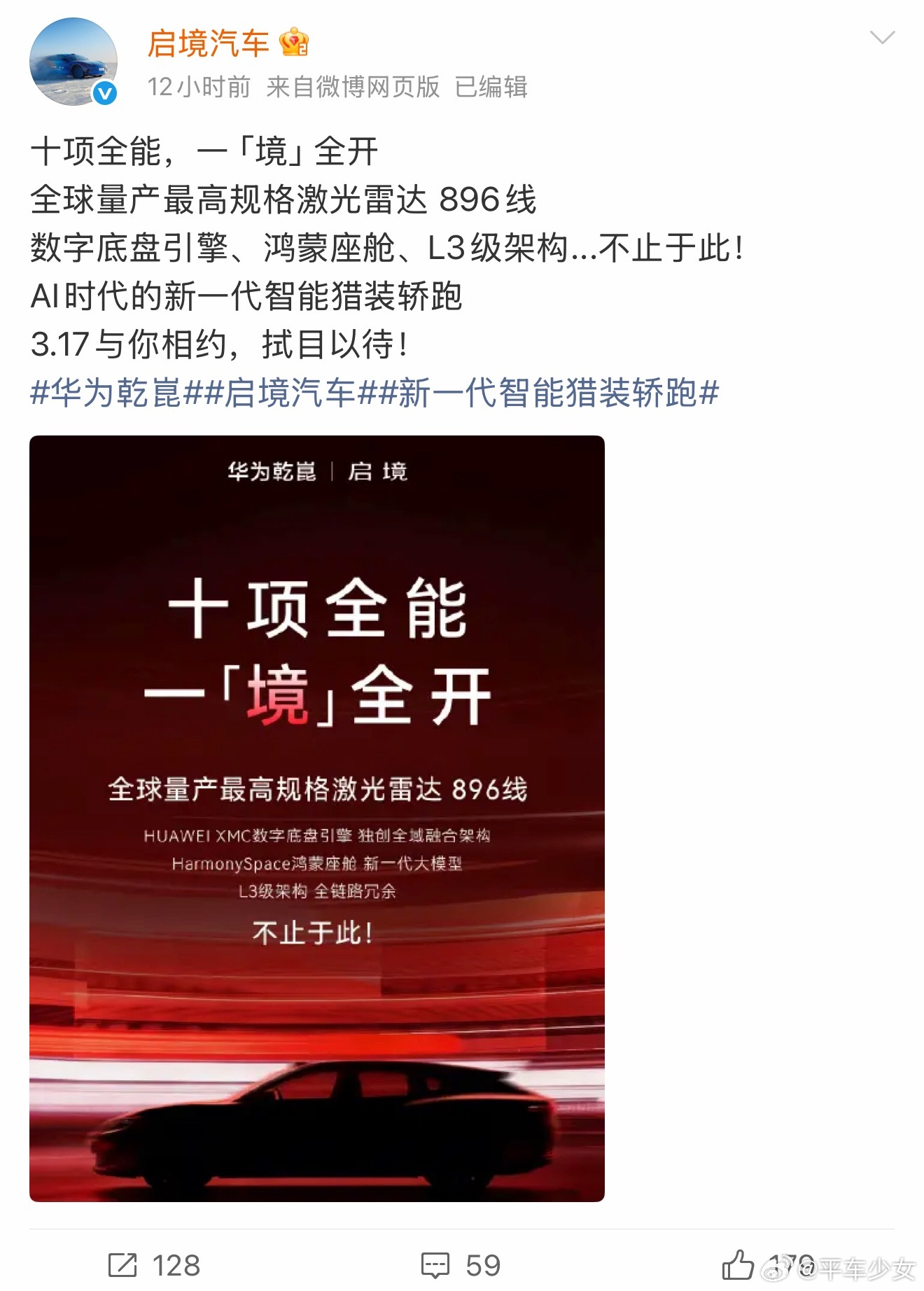启境汽车发布“一境全开”预热海报,释放全新7系重磅信号,广汽集团与华为乾崑双方深度合署办公协同研发的启境,自从官宣成立以来一直是车圈焦点,新车今天确认与旗舰尊界S800技术同源,搭载全球量产最高规格激光雷达896线,L3级架构,在感知、响应与操控层面实现越级表现。