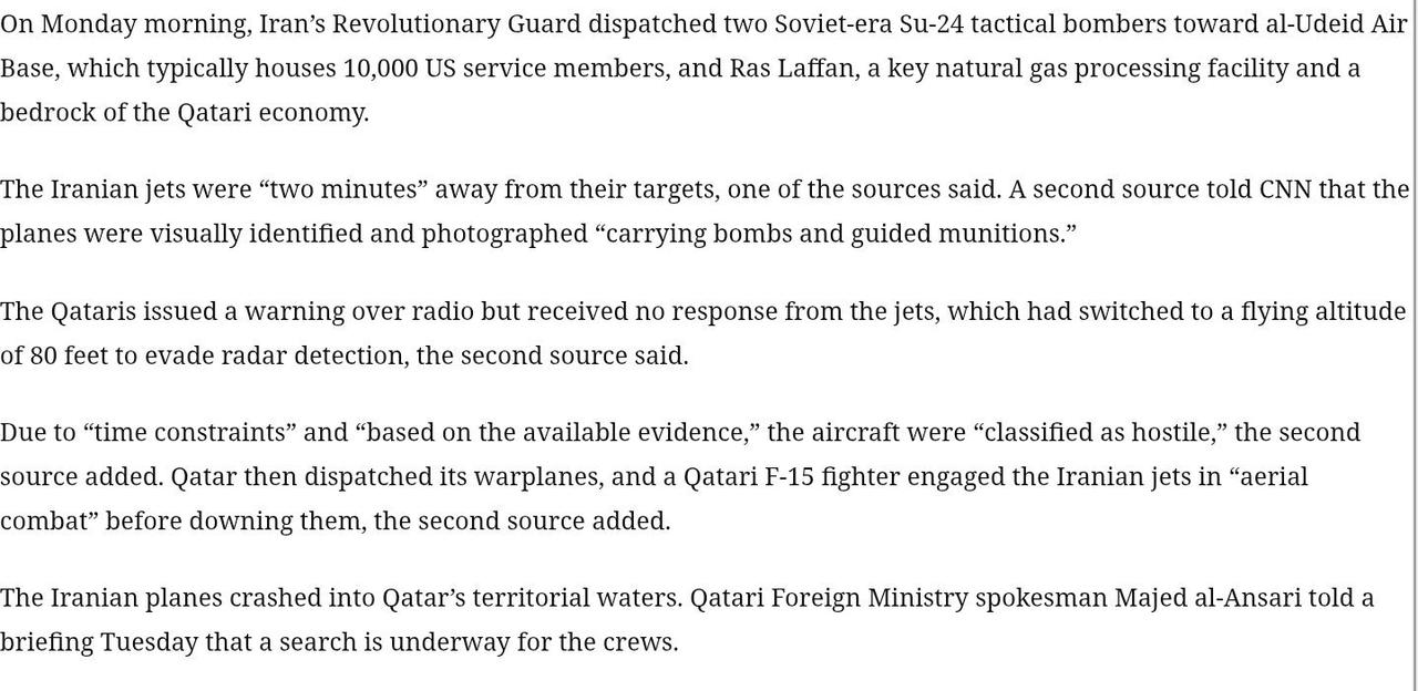 卡塔尔击落伊朗空军苏-24MK攻击机,空战细节曝光 卡塔尔空战的细节曝光了(图2),击落伊朗空苏-24MK攻击机(图3)的是卡塔尔空军最新从美国购买的F-15QA战斗机(图1),而不是欧洲的“阵风”或“台风”战斗机。报道称卡塔尔空军先对伊朗战机进行了目视观察,确认挂载了炸弹和制导武器,还剩2分钟即将飞临10000名美军驻扎的乌代德空军基地。卡塔尔空军在无线电上试图警告驱离,而伊朗飞行员不但不掉头离开,反而把飞行高度下降到25米准备超低空突防,卡塔尔不得不命令战斗机开火击落目标。搞笑的是西方媒体以为伊朗这波攻击是伊朗伊斯兰革命卫队空天军组织的,大概意思是只有革命卫队的飞行员才那么不怕死,伊朗国防军肯定不愿意有所作为。实际上伊朗苏-24MK攻击机全都装备在伊朗空军攻击机中队,被认为是最忠诚最受信任的飞行中队之一。