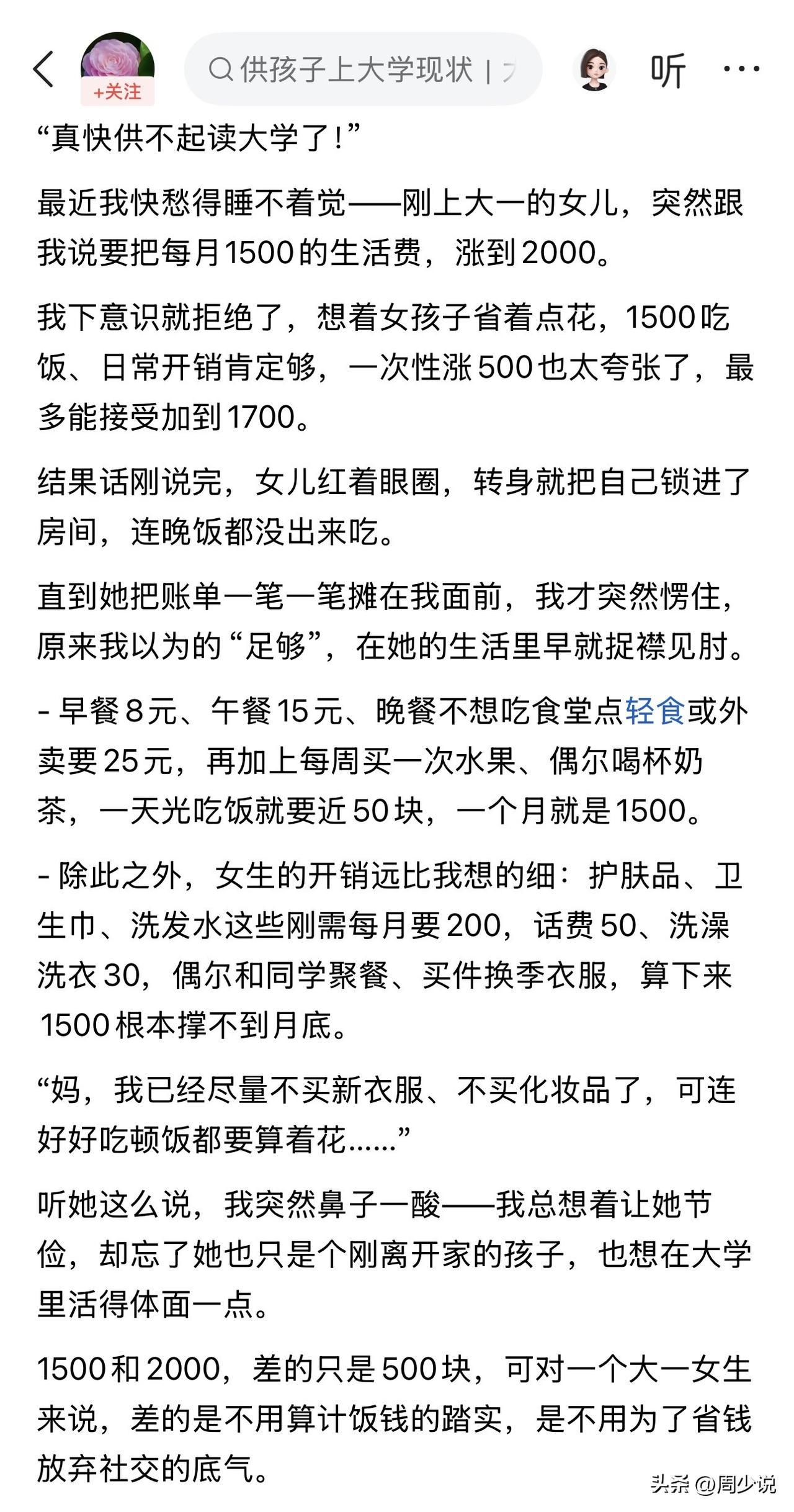 “这大学,真的快供不起了!”一位妈妈,最近因为女儿生活费的事,整夜辗转难眠。刚上大一的女儿,突然开口,希望把每月1500元的生活费,提高到2000元。妈妈第一反应就是拒绝,在她的观念里,女孩子节省一点,1500元日常吃饭和基础开销,应该是够用的,她最多也只能接受涨到1700元。 没想到这番话,让女儿瞬间红了眼眶,一言不发躲进房间,晚饭都不肯出来。直到孩子把详细的账单摆在眼前,妈妈才彻底沉默。 一天三餐加水果奶茶,就近50元,一个月吃饭就要1500元。再加上护肤品、日用品、话费、洗衣费,偶尔同学聚餐,1500元根本撑不到月底。女儿委屈地说,自己已经很少买新衣新物,可连吃饭都要精打细算。 此事一出,网友纷纷破防。有人说:“不是孩子乱花钱,是现在大学开销真的高”。 也有人感慨:“父母总觉得够用,却不懂孩子在外的不容易”。 其实,这件事周少觉得真的值得每一位家长深思,更是两代人生活观念的碰撞。我们习惯用自己的生活经验去衡量孩子,却忘了时代不同,校园里的生活成本早已悄悄改变。 1500元和2000元,相差不过几百块,背后却是孩子远离家乡,不用处处拮据的尊严与底气,这一点相当重要。 可以说,真正的爱,不是一味要求孩子节俭,而是学会换位思考,理解她的难处。如果真的花,那确实可以适当加一些。当然,这也要根据家庭经济情况而定,量力而行。 总之,面对这种情况,多一份包容与体谅,比单纯的金钱给予,更能让孩子感受到家的温暖,这才是亲子相处里,最珍贵的教育。 那么问题来了,对于这种情况,大家说要不要答应涨到每个月2000元生活费呢?#寻美三湘# #周少说教育#