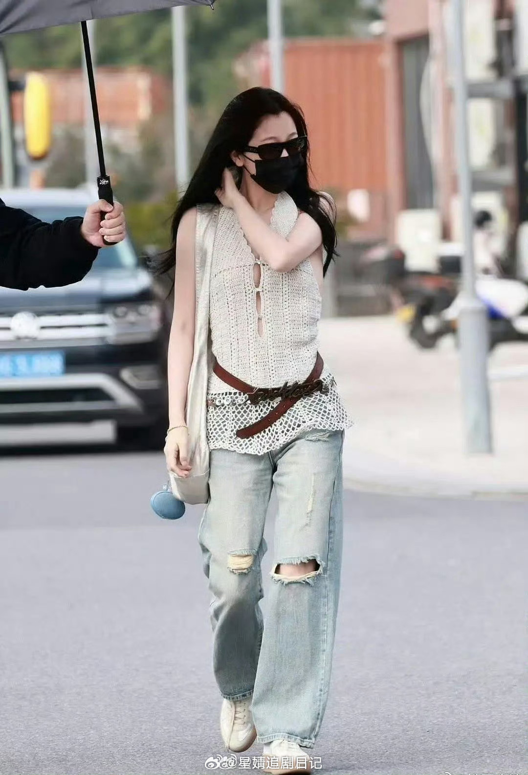 刘亦菲这条裤子挺养生,毕竟降温了肚脐眼必须护住啊