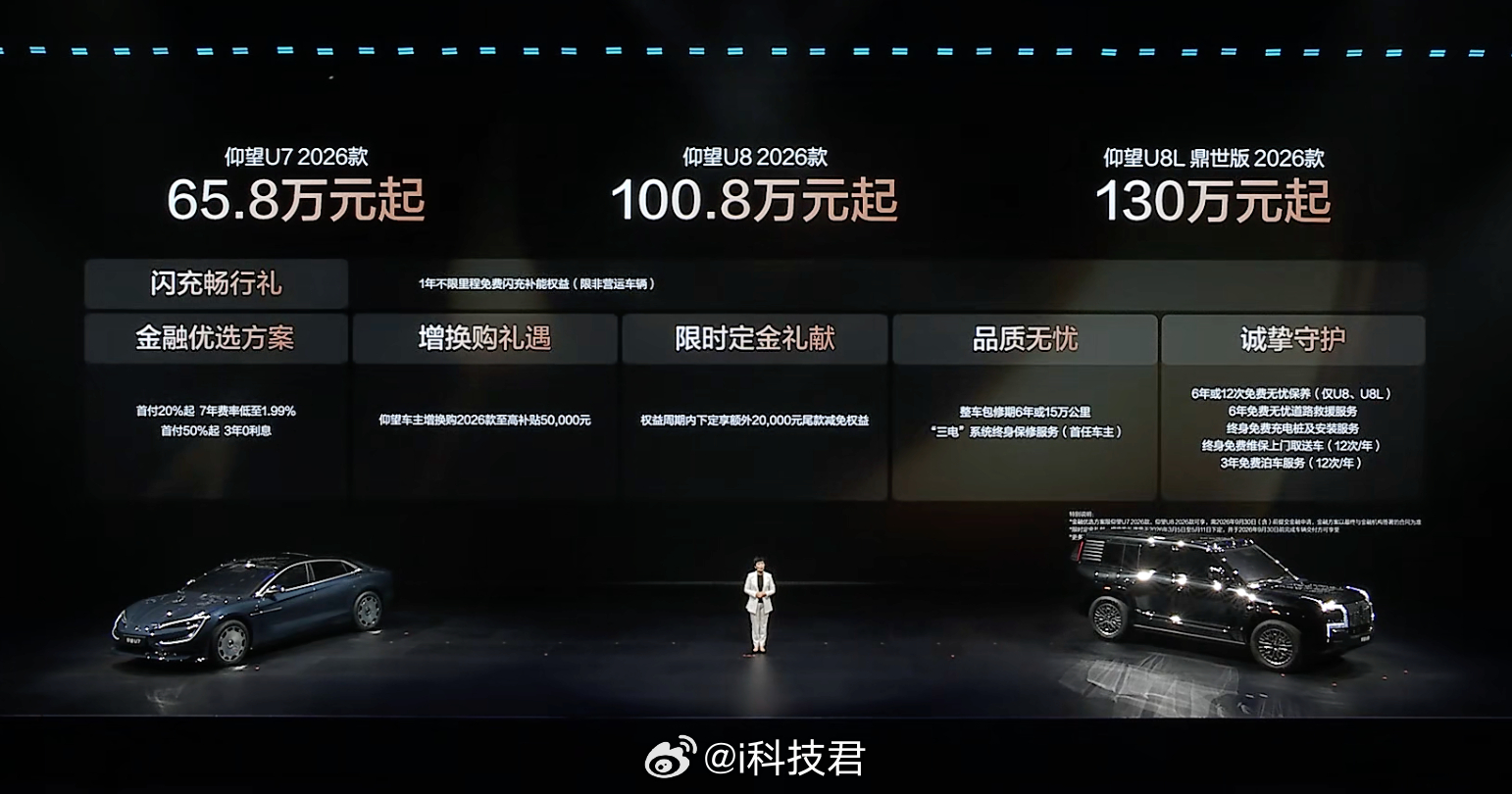 比亚迪今晚发布二代刀片及闪充 2026款仰望U7:65.8万元起2026款仰望U8:100.8万元起2026款仰望U8L:130万元起