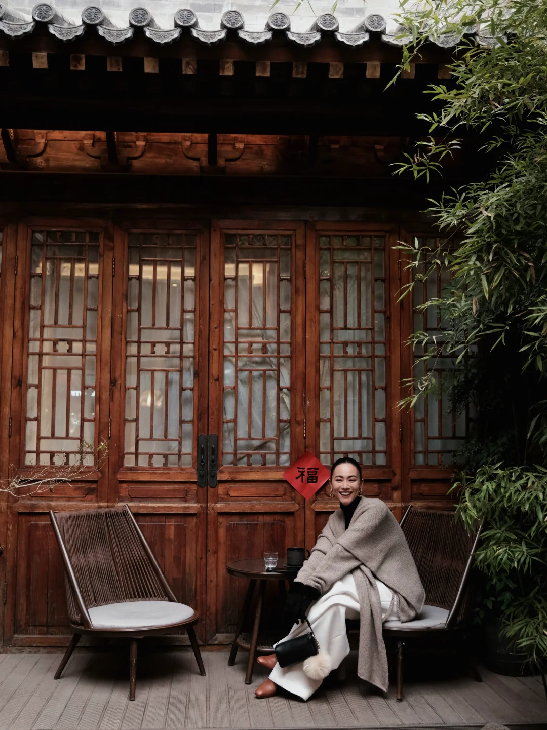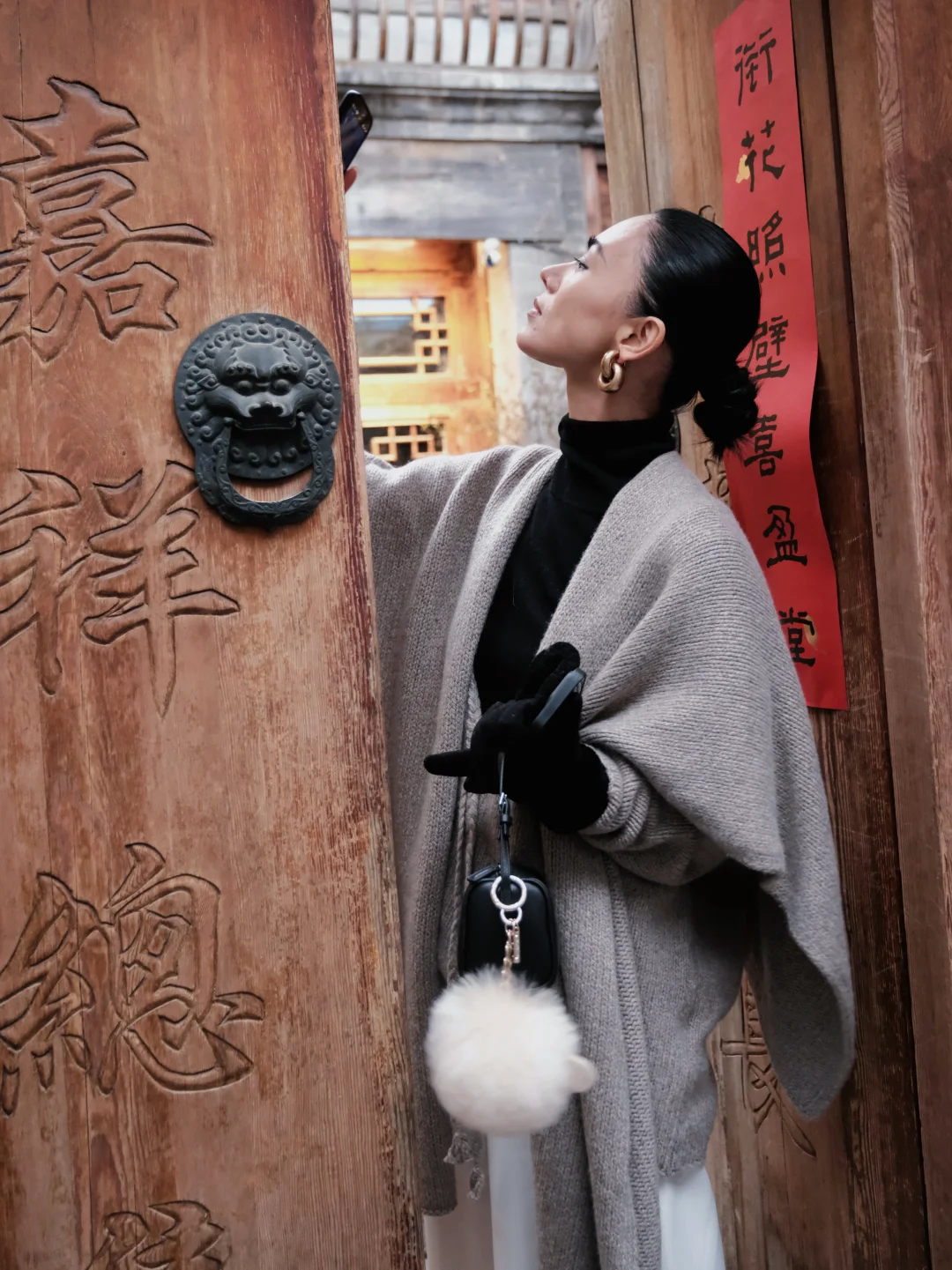 风拂柳,粉樱绽放,我身着浅粉蕾丝旗袍,立于古栏之下。长袖轻笼,盘髻缀珠,耳坠摇曳