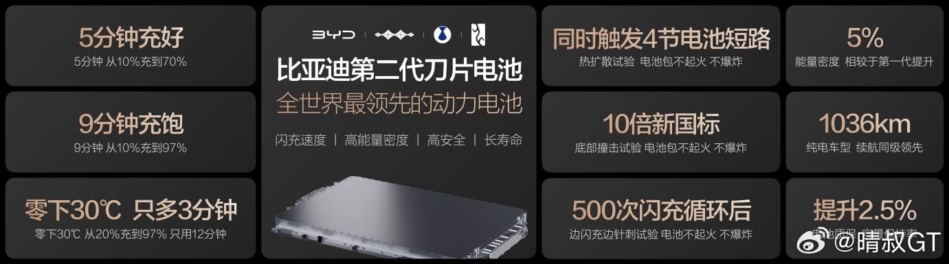 电动化上半场完美收官:比亚迪发布第二代刀片电池及闪充技术 备选标题: 比亚迪发布第二代刀片电池及闪充技术,引领新能源汽车迈入闪充时代 2026年3月5日,比亚迪在深圳大运中心体育馆召开“闪充中国 改变世界”发布会。正式发布:第二代刀片电池及闪充技术,创造全球量产最快充电速度新纪录,从10%到70%,只用5分钟就能充好;从10%到97%,只用9分钟就能充饱;零下30度,从20%到97%,只比常温多3分钟。一举攻克了电动化上半场“充电慢”和“低温充电难”的世界性难题,电动化上半场至此完美收官。同时,发布“闪充中国”战略,年底将在全国建设20000座闪充站,让用户充电更自由、更便捷,从此新能源汽车充电迈入闪充时代。 发布会现场,王传福还宣布:所有搭载第二代刀片电池的闪充车车主,均享有重磅“闪充权益”,自交车之日起,在全国闪充站可享受1年的免费闪充权益,让闪充体验更畅快。并且,在闪充免费期结束后,也会同行业保持一致,不会额外收费。 电动化上半场最后“顽疾”——充电慢、低温充电难 当前,电动出行的体验仍被一些现实痛点所困扰:电量还剩一半便心慌,假日出行充电排长队成常态,低温充电更是一把鼻涕一把泪。这些焦虑,给用户带来了巨大的精神负担,为了缓解,也造成国家铜资源和社会成本的巨大浪费。比亚迪王传福指出:“治理这些顽疾,必须要治根。所有问题的根源,就是充电慢和低温充电难”。 比亚迪第二代刀片电池,重新定义全世界最领先动力电池 要解决这些根源性问题,关键看电池。六年磨一刀,比亚迪正式推出第二代刀片电池,带来了颠覆性的闪充体验,实现“常温充电,5分钟充好,9分钟充饱;低温充电,零下30度,只多3分钟”,让充电和加油一样快,超越过往,前所未有。 一直以来,“闪充”与“高能量密度”是行业公认的一对矛盾体。比亚迪在实现闪充的同时,确保了能量密度不降反升,相比第一代提升5%以上。再加上整车的轻量化、高效化创新,搭载第二代刀片电池的腾势Z9GT,续航做到了1036公里。 第二代刀片电池通过打造“锂离子高速通道”和“全温域智能热管理系统”,实现了更低的产热和更高效、均匀的散热,让闪充对电池寿命几乎没有影响。基于这样的底气,比亚迪还宣布电池质保政策再加码!第二代刀片电池质保的“容量保持率”整体提升2.5%,电芯依旧是“终身保修”,这就是第二代刀片电池,给所有用户的安心承诺。 第二代刀片电池继续将安全进行到底,通过一系列超越新国标的安全测试,为用户打造最安全的电池,确保电池全生命周期都安全,彻底打消用户的安全顾虑。 比亚迪第二代刀片电池,既给到用户前所未有的闪充速度,又给超1000公里的超长续航,还给更长的寿命和更高的质保政策,更给远超新国标的安全,这就是全世界最领先的动力电池!
