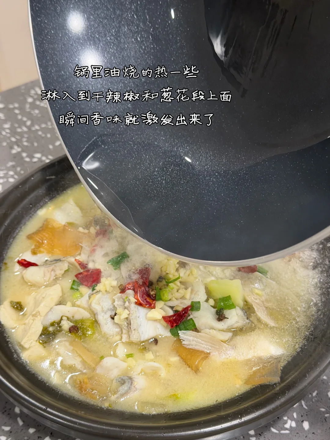 8. 锅里油烧的热一些淋入到干辣椒和葱花段上面