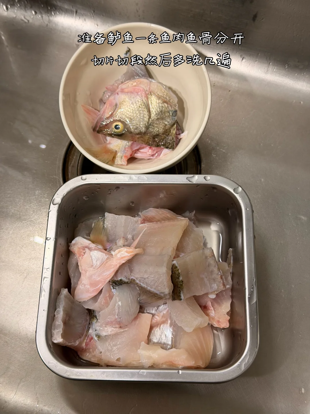 1. 准备鲈鱼一条鱼肉鱼骨分开切片切段然后多洗几遍