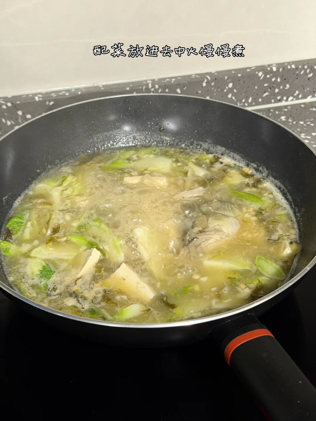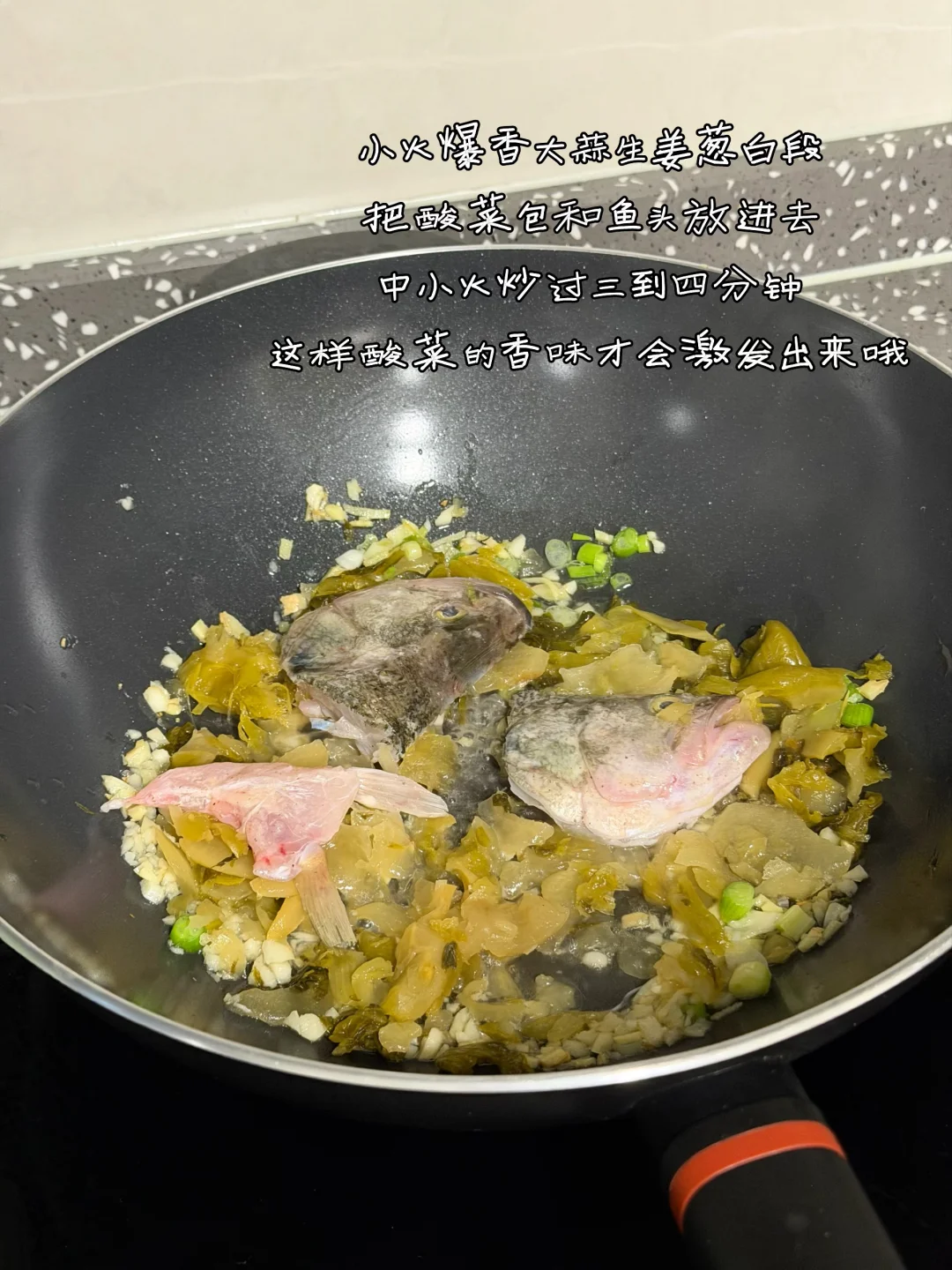 4. 小火爆香大蒜生姜葱白段,把酸菜包和鱼头放进去,中小火炒过三到四分钟,这样酸菜的香味才会激发出来哦