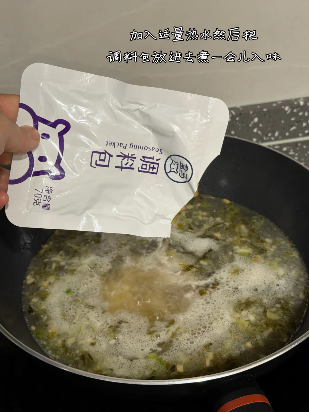 5. 加入适量热水然后把调料包放进去煮一会儿入味,配菜放进去中火慢慢煮