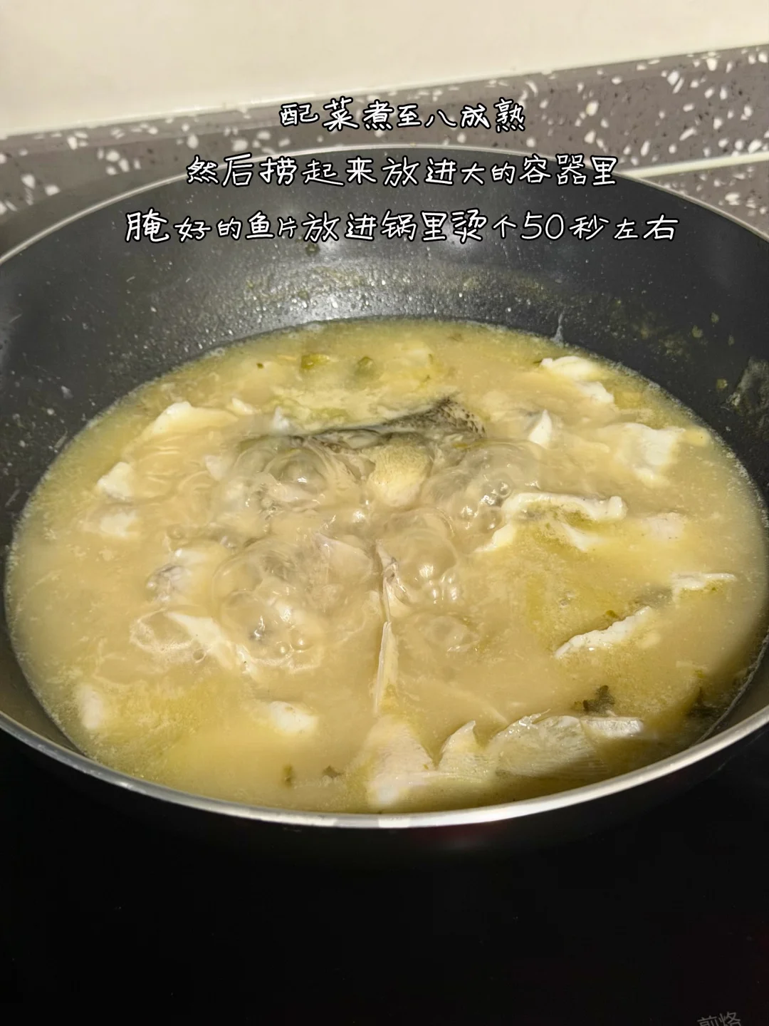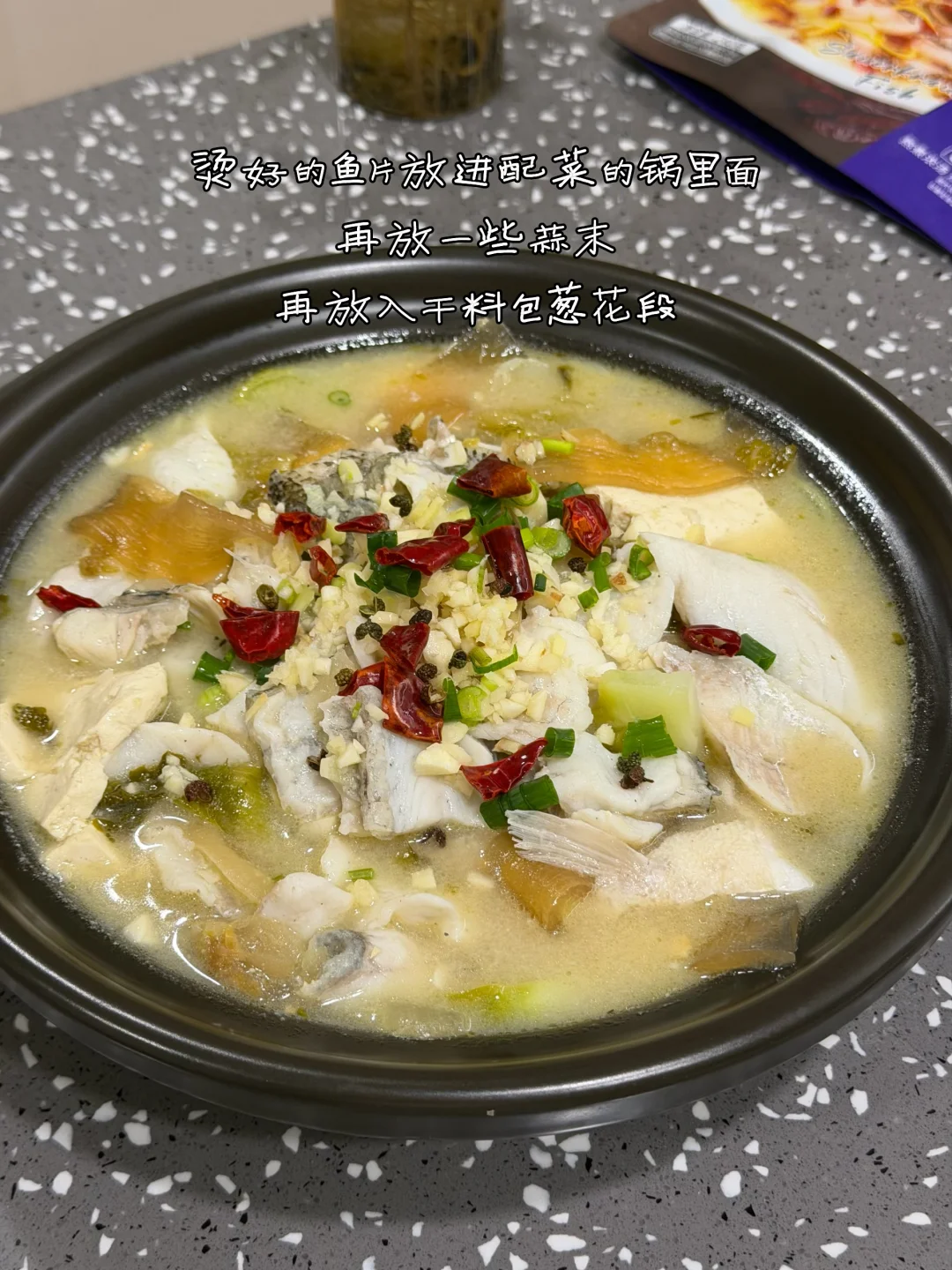 7. 烫好的鱼片放进配菜的锅里面再放一些蒜末