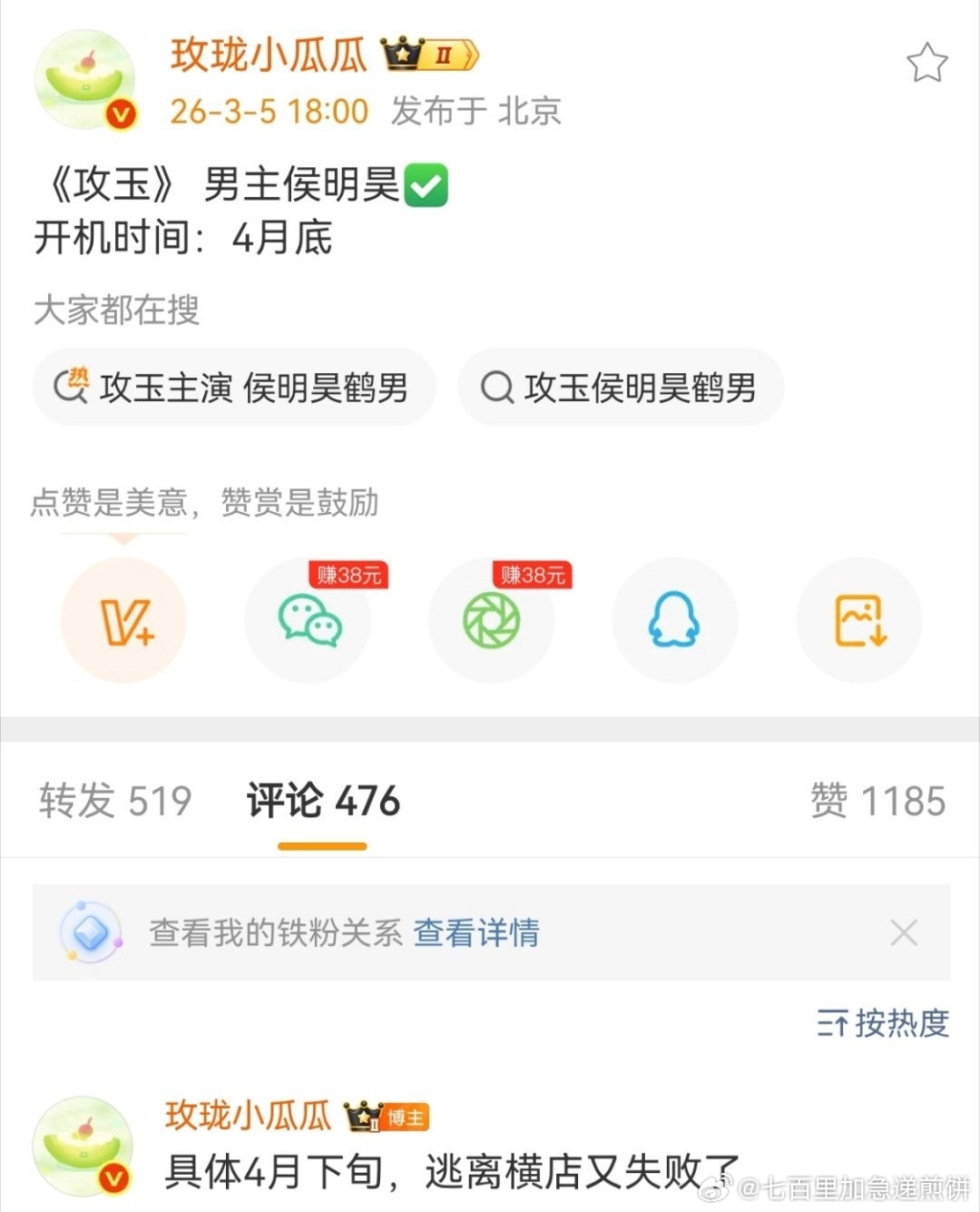侯明昊的两个饼,一个是《攻玉》,和鹤男搭档,4月下旬开机,一个是《偏偏宠爱》的男主江忍