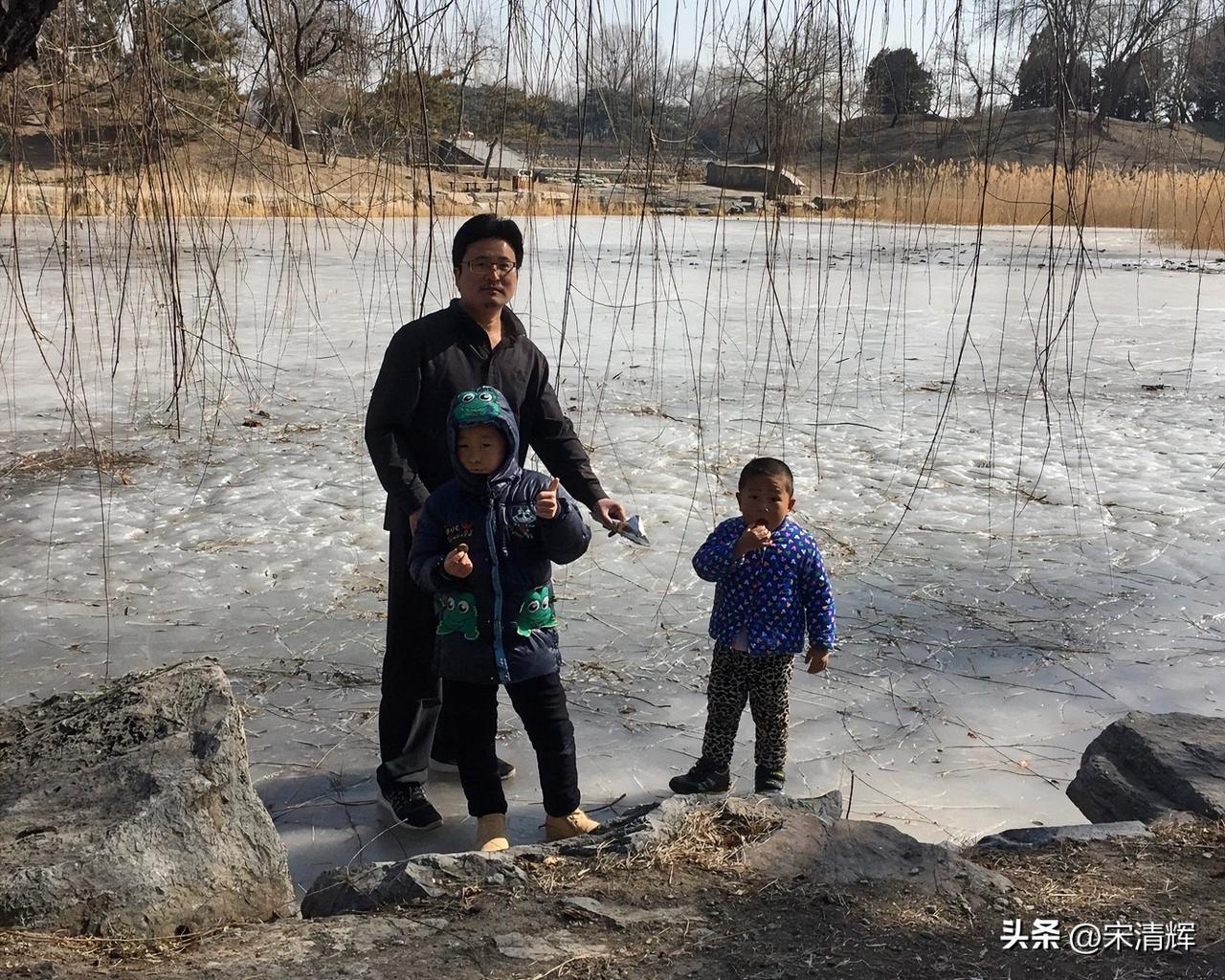(1563):照片为:2018年2月13日,12时33分,宋清辉与两个孩子在北大未名湖畔。