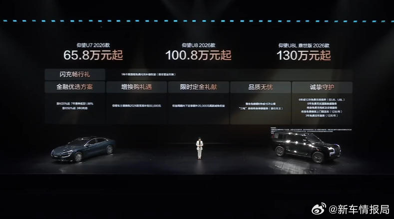 仰望车型闪充版上市 2026款仰望U7、U8、U8L闪充版已于今日正式上市,搭载比亚迪第二代刀片电池与兆瓦闪充技术。新车情报局