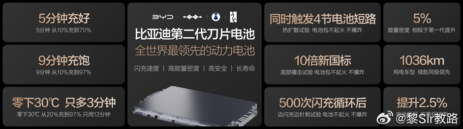 1. 第二代刀片电池及闪充技术,从10%到70%,只用5分钟就能充好;从10%到97%,只用9分钟就能充饱;