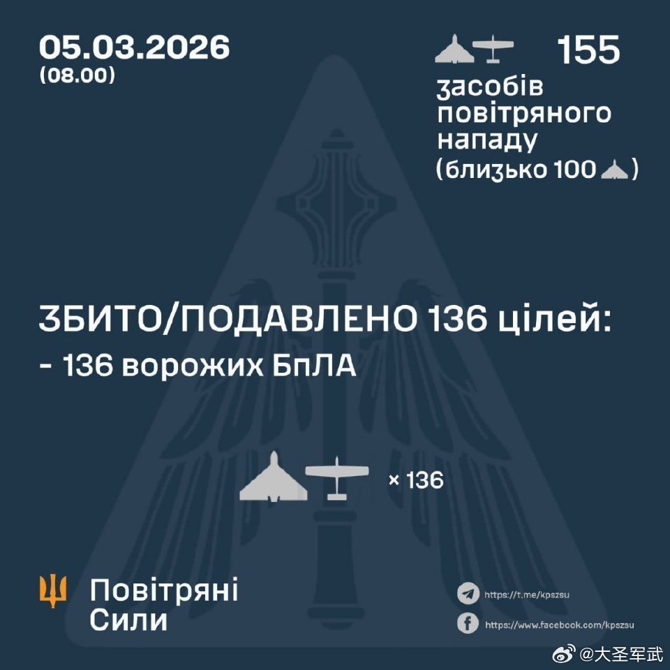 乌军防空部队击落来袭的俄军155架无人机中的136架。关注俄乌局势最新进展俄乌冲
