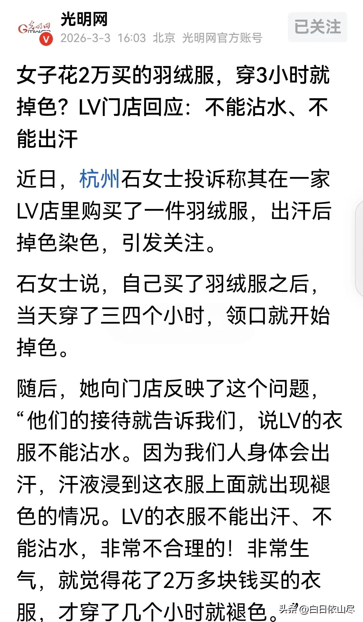 “笑不活了!”浙江杭州,一女子砸20000元,买了一件大牌羽绒服,才过了3小时,竟惊讶的发现羽绒服领口掉色,就赶紧去门店理论,门店却说:我家的羽绒服不能沾水、不能出汗。女子懵了!网友:买回家得供着不能穿呗?只适合当随葬品,因为逝者不出汗。 花两万块买件大牌羽绒服,本想穿着体面又保暖,结果刚美了3小时就出问题,找门店理论,还被工作人员的说法整懵,浙江杭州这位女子的遭遇,让不少网友看完又好气又好笑。 前不久,杭州的石女士特意去当地商场的大牌专柜,挑选了一件售价20000元的羽绒服。作为轻奢大牌的服饰,石女士原本对这件衣服的品质满怀期待, 想着花高价买的衣服,不管是面料、做工还是质量,都该有对应的保障,买完之后满心欢喜地穿上身,准备出门好好臭美一番。 当天天气微凉,石女士穿着这件新羽绒服出门,全程没有碰到水,也没有做剧烈运动,只是正常逛街、走路,顶多因为走路微微出了点薄汗。 可仅仅过了3小时,石女士无意间低头,就发现羽绒服的领口位置出现了明显的掉色情况,原本干净的领口染上了深色印记,甚至还蹭到了内搭的衣服上,好好的一件新衣服,瞬间变得斑驳不堪。 看着刚穿没多久就掉色的羽绒服,石女士又心疼又气愤,两万块钱买的衣服,连最基本的色牢度都达不到,这和普通平价衣物的质量相差甚远。 她第一时间带着羽绒服,赶到购买的专柜门店,想要讨个说法,要求门店给出合理解释,或是进行退换货处理。 石女士将掉色的情况如实告知门店工作人员,还拿出衣服展示掉色的部位,本以为门店会重视问题,积极处理售后,可门店工作人员的回应,让她当场彻底懵住。 工作人员面对石女士的质疑,没有检查衣服质量问题,反而轻描淡写地表示,这款大牌羽绒服不能沾水,也不能出汗,人体分泌的汗液接触到面料,就会导致掉色,这属于正常情况,并非产品质量问题。 这样的说法让石女士难以接受,羽绒服本就是冬季穿着的衣物,人体日常活动难免会出汗,沾水更是生活中无法完全避免的情况,花两万块买的衣服,居然连正常穿着的基本需求都满足不了,这无疑是高价低质。 她当即和门店工作人员沟通,指出这样的售后说辞完全不合理,衣服是用来穿的,不是摆着看的,不能因为是大牌,就无视消费者的正常使用需求。 这件事被石女士分享出来后,迅速在网上引发热议,网友们的评论更是犀利又真实。不少网友调侃,这哪里是买羽绒服,分明是买了个“祖宗”,买回家得供起来,不能穿不能碰,完全失去了衣物的使用价值; 还有网友直言,大牌的溢价全在品牌上,质量却毫无保障,拿着天价费用,却做出不合格的产品,售后还如此敷衍; 更有网友犀利吐槽,这衣服只适合摆着,根本不适合日常穿着,高价买的衣物连基本的穿着属性都没有,实在离谱。 截至目前,石女士依旧在和门店沟通维权,还将衣服送去相关机构检测,想要通过正规途径,维护自己的合法权益。 对此,你们有什么看法,欢迎评论留言~