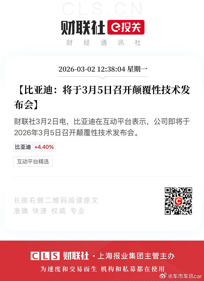 比亚迪将发布颠覆性技术比亚迪股票大涨7%3月5号比亚迪发布颠覆性技术市场已提前沸腾。 3月5日惊蛰,比亚迪将发布电动化颠覆性技术,王传福口中“更惊艳的技术”即将揭晓!全国快充基建加速落地,这场技术大招或将改写新能源格局。3月5日锁定发布会,坐等行业惊雷!