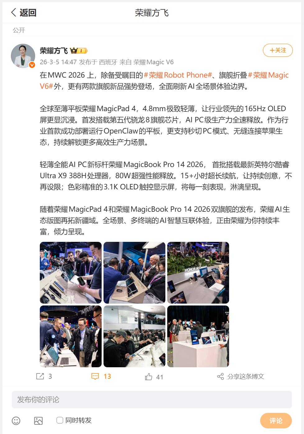 MWC 2026荣耀亮眼的产品,除了荣耀Magic V6、荣耀Robot Phone、荣耀Robot以外,荣耀产品线总裁方飞表示,荣耀MagicPad 4和荣耀MagicBook Pro 14 2026非常值得肯定,前者全球至薄、行业首款成功部署运行OpenClaw的平板、秒切PC模式几大特点让平板也变成了生产力工具,后者15+小时超长续航,对标并超越了苹果的续航,而且荣耀AI加持下体验感直接拉满 畅聊数码新品 数码资讯