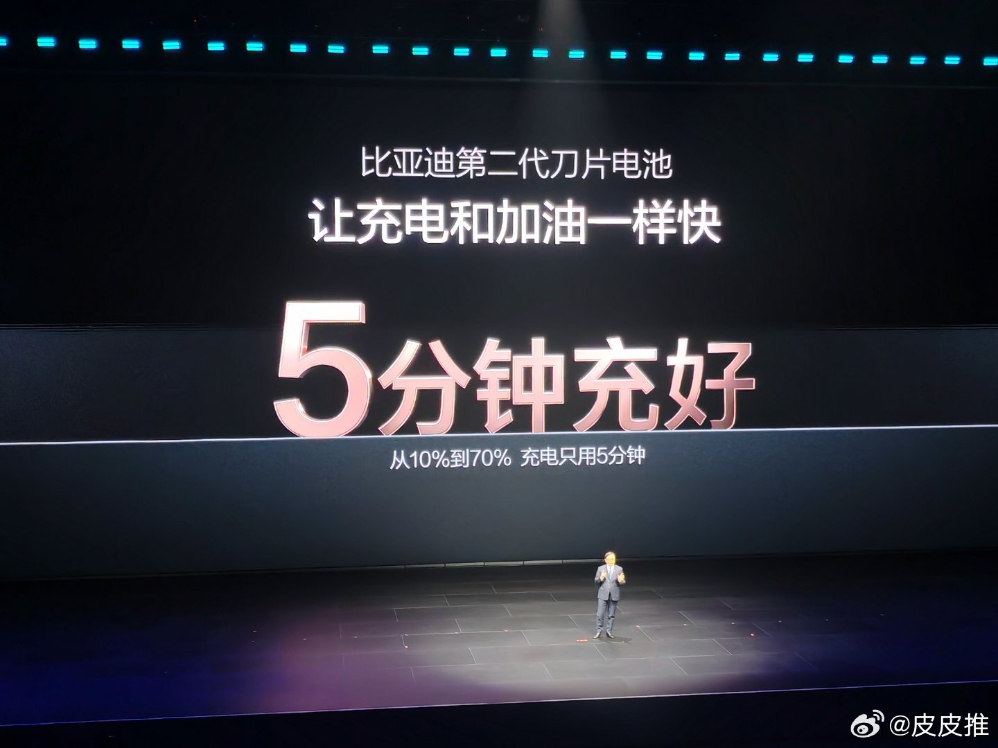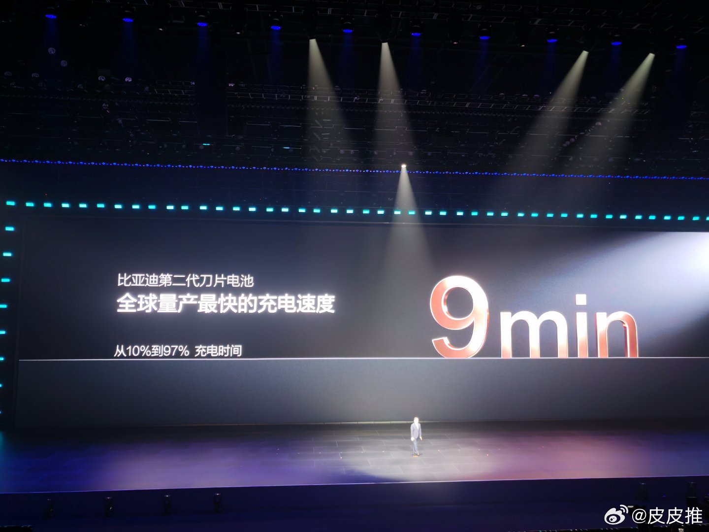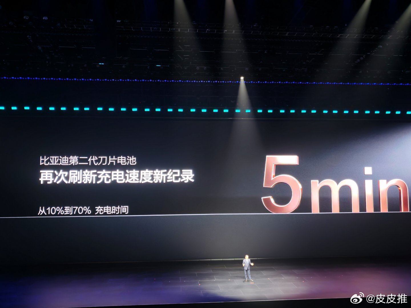 比亚迪今天推出了颠覆性技术:比亚迪第二代刀片电池比亚迪闪充技术,从10%到70%只用了5分钟,从10%到90%只用了9分钟,让充电和加油一样快,比亚迪真正实现了5分钟充好,9分钟充饱。科技先锋官 深圳·深圳大运中心体育馆