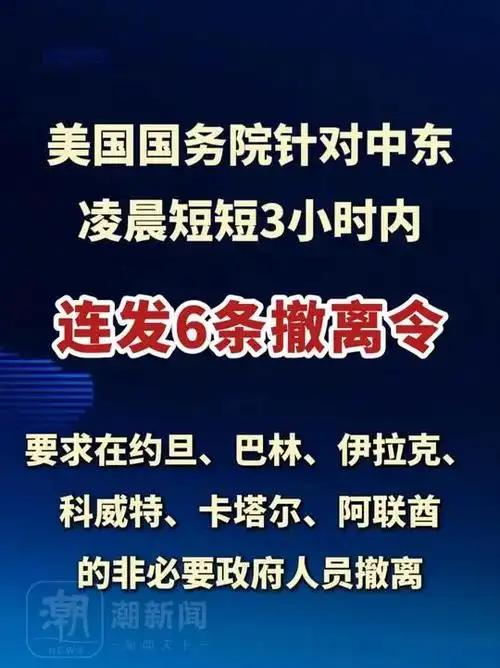 【美国连发8条撤离令】 美东时间3月3日,美国国务院在一天之内密集发布了8条撤离令,覆盖中东多个国家,引发全球关注。当天凌晨,短短3个小时里,6条撤离令接连下达,涉及约旦、巴林、伊拉克、科威特、卡塔尔、阿联酋六国,要求这些国家的美国非必要政府人员及其家属尽快撤离。 到了深夜,又有两条撤离令接踵而至,将阿曼和沙特阿拉伯也纳入其中,完成了这场罕见的密集撤离部署。 这次撤离行动并非毫无预兆,在此之前,美国国务院就已经发布过相关警示,敦促15个中东国家和地区的美国公民立即撤离,为后续的密集撤离指令埋下了伏笔。 不同于以往逐步推进的撤离模式,这次3小时连发6条指令的速度,在美国外交史上十分罕见。能看出局势的紧迫性已经到了不容忽视的程度。 此次被纳入撤离范围的八个国家,分布在中东不同区域,既有紧邻以色列的约旦,也有波斯湾周边的海湾国家,这些国家大多是美国在中东军事存在的重要据点。 其中,科威特、巴林等国境内设有美军核心基地,此前已经遭遇过不同程度的袭击,美国驻科威特大使馆更是提前发布声明,提醒民众远离使馆区域,避免受到导弹和无人机袭击的波及。 而使馆院内曾冒出的浓烟,也让当地的紧张氛围进一步升级。随着撤离令的全面下达,美国驻中东多国使馆陆续采取临时关闭措施,工作人员忙着整理文件、协调撤离事宜,原本正常的外交办公秩序被彻底打乱。 与此同时,美国国务院还在社交媒体上以红色图标持续更新相关国家的旅行警告,进一步扩大警示范围。提醒在当地的美国公民尽快利用商业交通撤离,不要拖延。 值得注意的是,美国的撤离行动并非个例,就在其发布密集撤离令的同时,全球多个国家也同步启动了撤侨计划。 韩国计划撤离在中东的2.1万公民,日本组织陆路撤侨,俄罗斯动用军机接回外交人员,超过20个国家将伊朗、以色列等国列为最高风险区,要求公民立即离开。 这种多国步调一致的行动,背后是对中东局势可能进一步升级的共同判断。此次美国密集发布撤离令,背后和近期中东地区的局势动荡密切相关。 美以联合对伊朗发动军事打击后,伊朗发起了大规模报复行动,打击范围覆盖中东多个美军基地,不少海湾国家因为境内有美军设施,直接成为了反击目标。 阿联酋迪拜的机场航站楼、卡塔尔的预警雷达都曾遭到袭击,民用设施受波及的同时,也让当地的安全风险从潜在威胁变成了现实危险。除了直接的军事袭击威胁,交通中断也让撤离变得刻不容缓。 为应对空中威胁,中东多国相继关闭领空,商业航班大面积取消或停飞,迪拜、阿布扎比等主要航空枢纽运营受阻,正常的撤离渠道正在快速收窄。 若是不及时下达撤离令,留在当地的非必要人员很可能会被困在战区,陷入两难境地。美国驻沙特大使馆在发布撤离令的当天,还遭遇了两架无人机袭击,引发局部火灾,虽然没有造成人员伤亡,但也让当地的安全形势更加严峻。 而科威特境内发生的一件事,更能看出局势的混乱——三架美军F-15E战斗机,没有被伊朗导弹击落,反而被科威特自己的防空系统误击坠毁。足以说明当地的紧张程度已经到了草木皆兵的地步。目前,美国的撤离工作正在推进中,而中东地区的局势依然充满不确定性。 霍尔木兹海峡作为全球重要的石油运输通道,面临被封锁的风险,一旦受阻,全球20%的石油运输将受到影响,进而波及全球油价和经济稳定。 而伊朗的反击态势依然强劲,美国的撤离行动究竟会对地区局势产生怎样的影响,后续是否还会有新的撤离指令,都还没有明确的答案。 这场罕见的密集撤离,牵扯到多个国家的利益和安全,也让中东地区的地缘博弈再次成为焦点。 美国一天连发8条撤离令,背后是对局势的预判和应对,而多国同步撤侨的行动,也让人们看到了这场危机的波及范围之广。 不知道大家怎么看这件事?你觉得美国密集撤离的背后,还有哪些不为人知的考量?中东局势接下来会朝着什么方向发展?欢迎留下你的观点一起讨论。