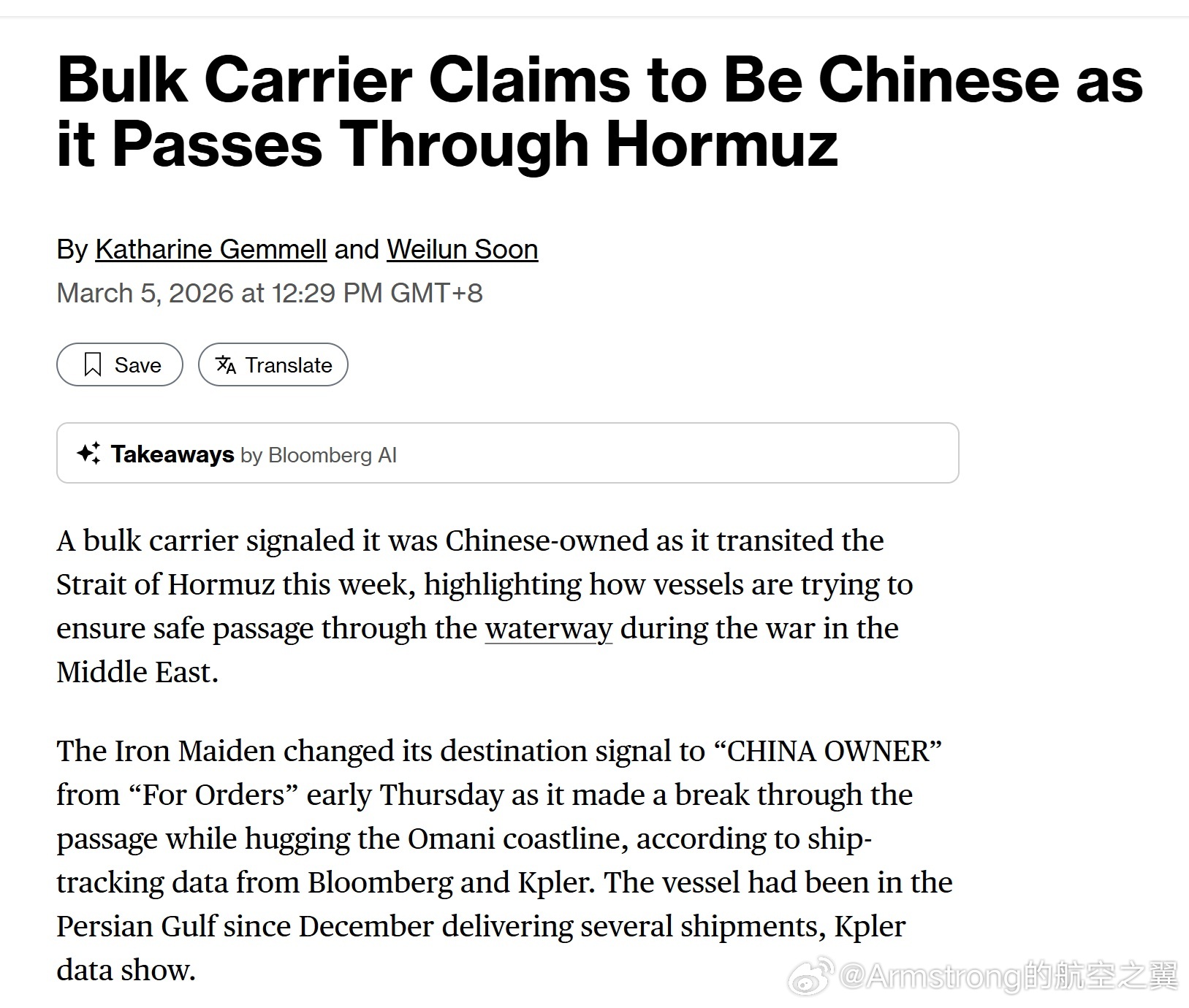伊朗报复美以 彭博社报道,根据Kpler最新船舶追踪数据显示,3月5日清晨,散货船 “铁娘子”号(Iron Maiden) 在通过霍尔木兹海峡时,将其自动识别系统(AIS)的目的地信号从 “待发货”(For Orders) 修改为 “中国船东”(CHINA OWNER)。