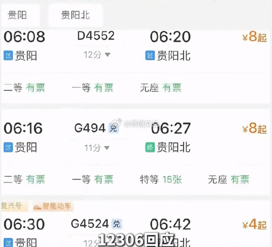 高铁一等座4元二等座8元 贵阳这趟高铁出现一等座 4 元、二等座 8 元的倒挂,其实是市场化浮动定价导致的。短途线路一等座需求少,折扣力度更大,二等座刚需稳定折扣小,才出现这种情况。