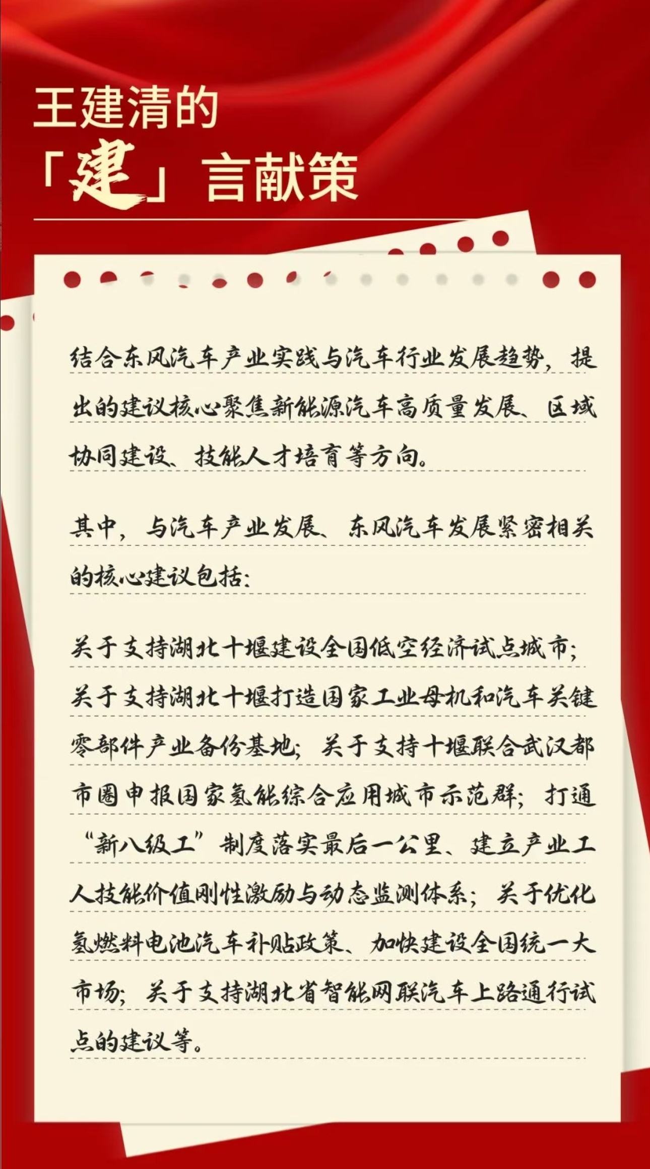东风汽车王建清2026两会建言 2026年全国两会期间,全国人大代表、东风汽车一线产业工人王建清结合东风汽车产业实践与汽车行业发展趋势,围绕新能源汽车高质量发展、区域协同建设、技能人才培育等方向提出系列建议,聚焦产业发展关键环节与制度落地中的实际问题。