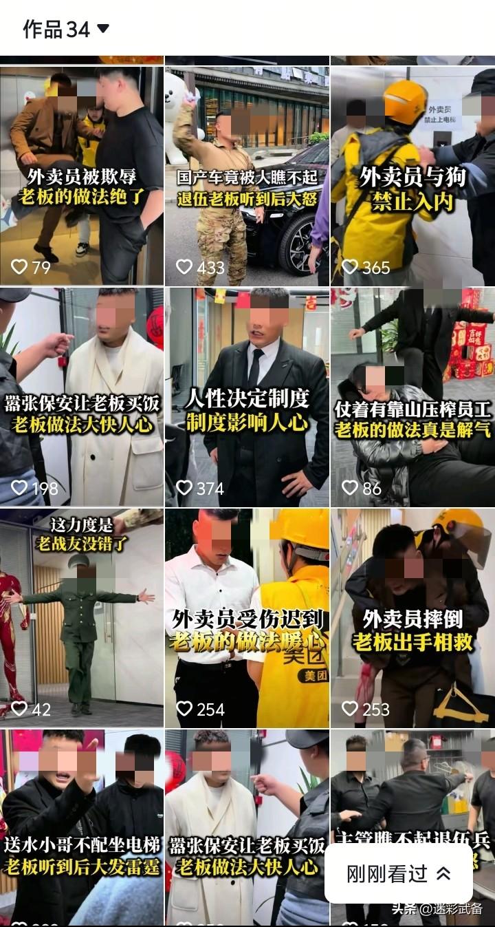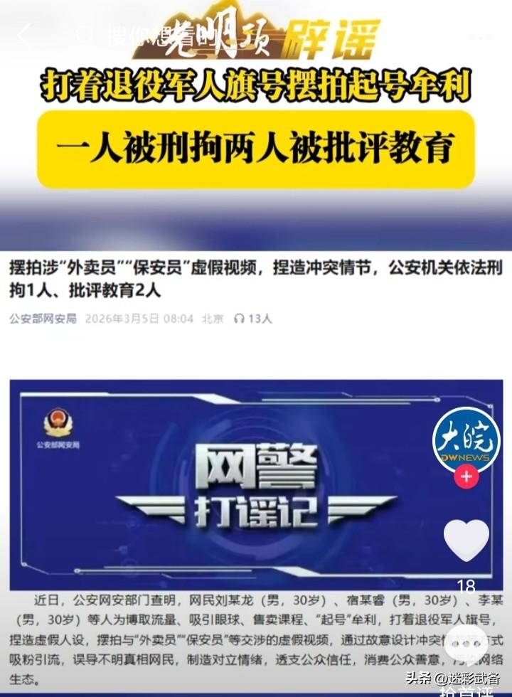 打着退役军人旗号、捏造虚假人设,与假冒退役军人有着本质的区别! 公安网安部门查明:网民刘某龙(男,30岁)、宿某睿(男,30岁)、李某(男,30岁)等人为博取流量、吸引眼球、售卖课程、“起号”牟利,打着退役军人旗号,捏造虚假人设,摆拍与“外卖员”“保安员”等交涉的虚假视频,通过故意设计冲突情节等方式吸粉引流, 这类似的视频我看到的可太多,就是一个剧本换不同的人演。而这些人都有一个共同的特点,都是退役军人!这可不是污蔑、抹黑退役军人,恰恰相反,而是揪出这些害群之马。这次网警公开信息中明确“打着退役军人旗号”而不是“假冒退役军人”,这是两种不同的性质!比如图三的这位,那不得了,上过央视军事栏目采访的某特种兵,现在就某音一个平台就十几个号,身穿军装,每天就是一堆他们自认为的正能量视频,同样的文案一群老兵天天哔哔。。。每天跑网上消耗军人情怀,误导不明真相网民,制造对立军民情绪,透支公众信任,消费公众善意,污染网络生态。