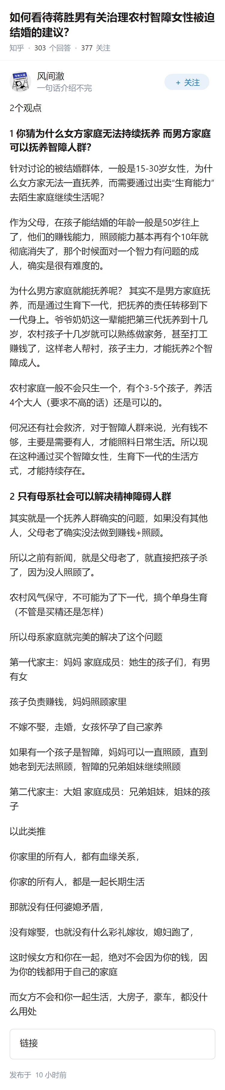 如何看待蒋胜男有关治理农村智障女性被迫结婚的建议?
