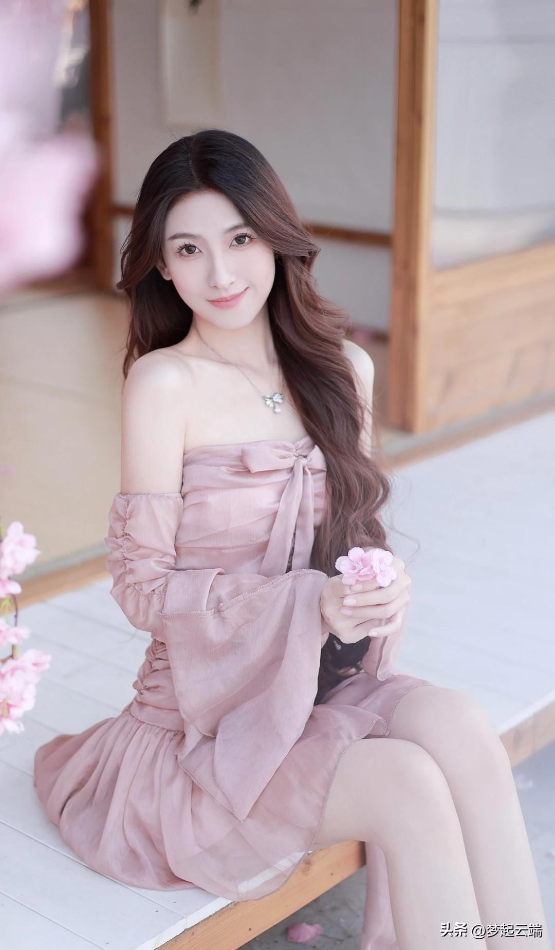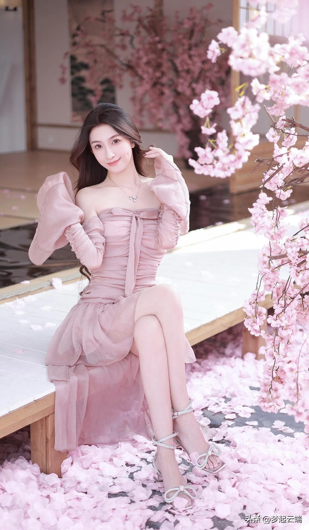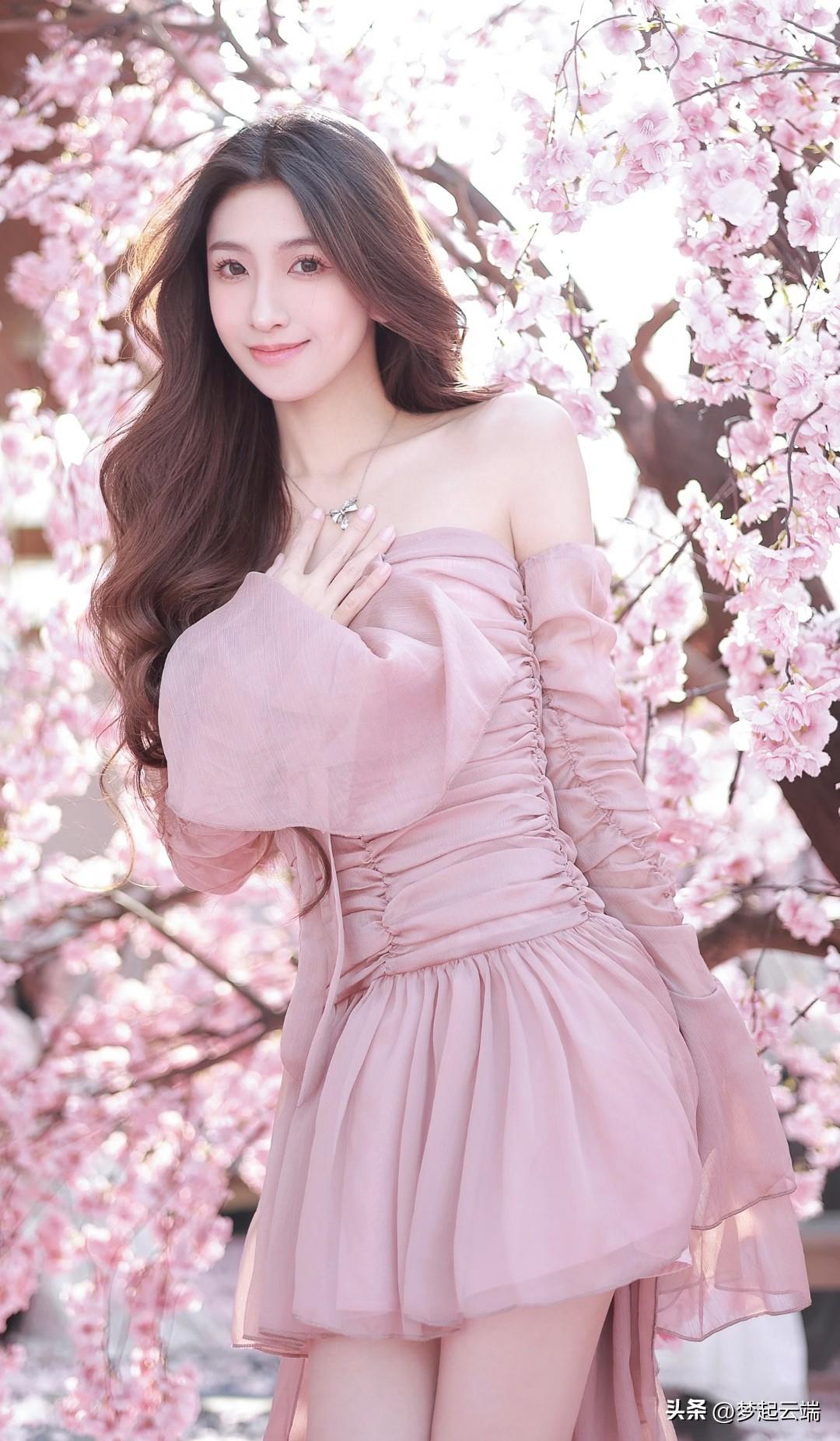 樱花树下,甜美少女,粉裙飘逸,春意盎然。