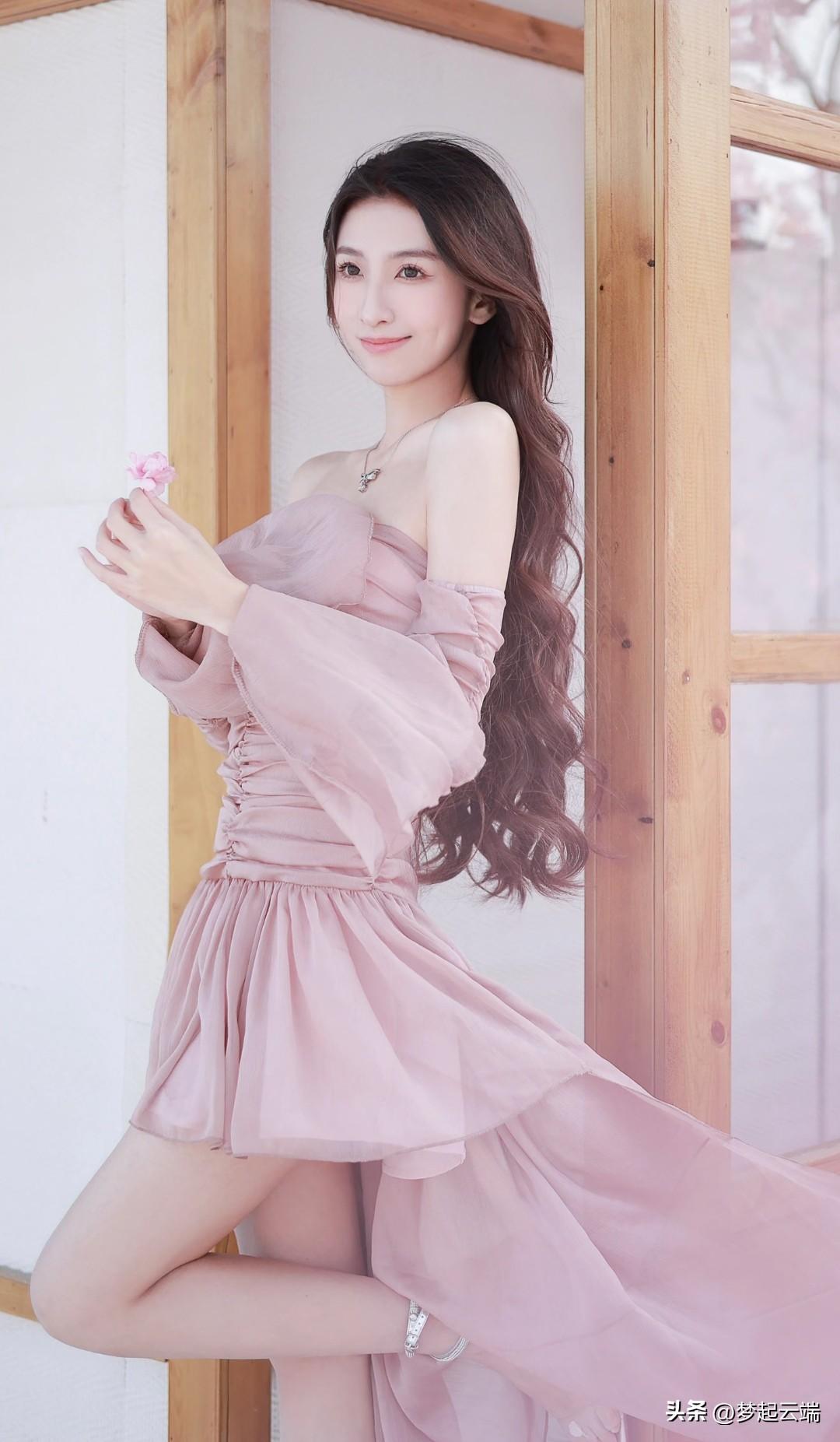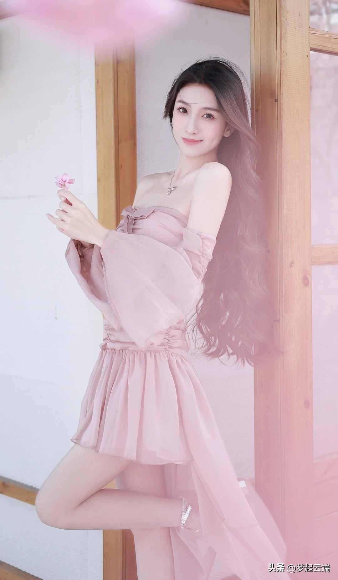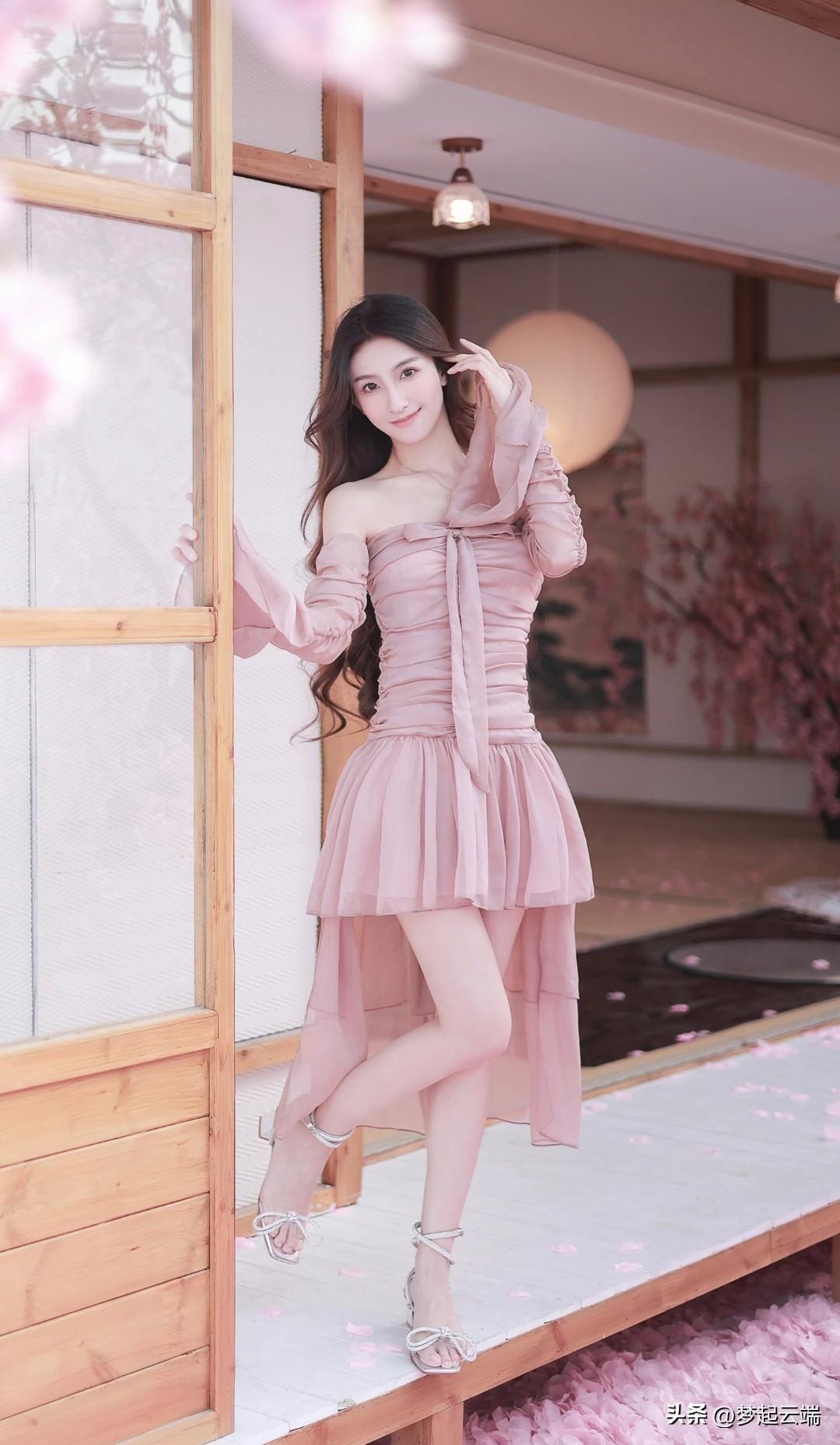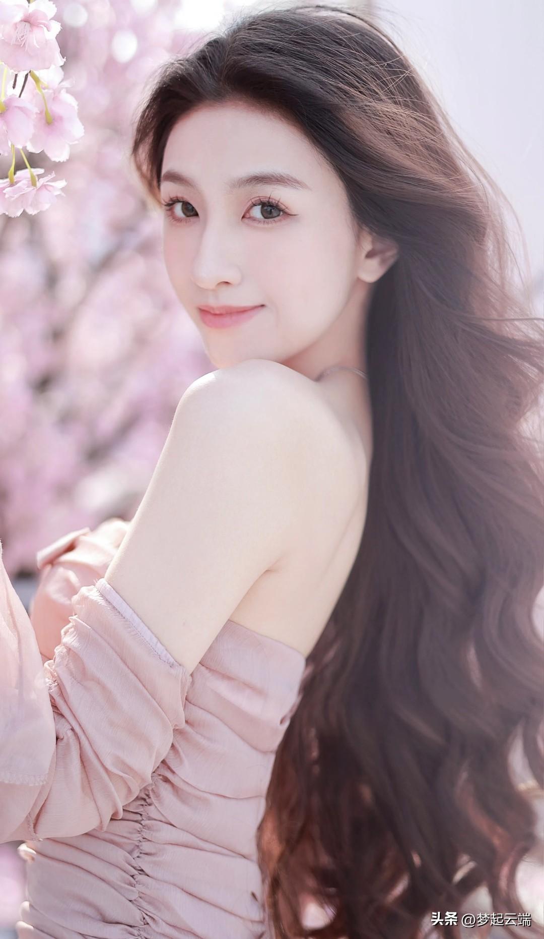 樱花树下,甜美少女,粉裙飘逸,春意盎然。