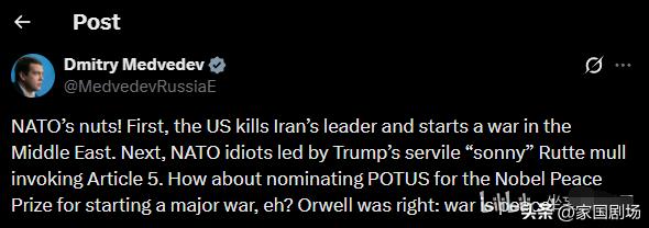 俄罗斯的梅德韦杰夫: 北约疯了!先是美国刺杀了伊朗领导人,挑起了中东战争。接下来,以特朗普的走狗“儿子”吕特为首的北约蠢货们竟然考虑启动第五条。 要不提名总统角逐诺贝尔和平奖,表彰他发动了一场大战?奥威尔说得对:战争即和平!