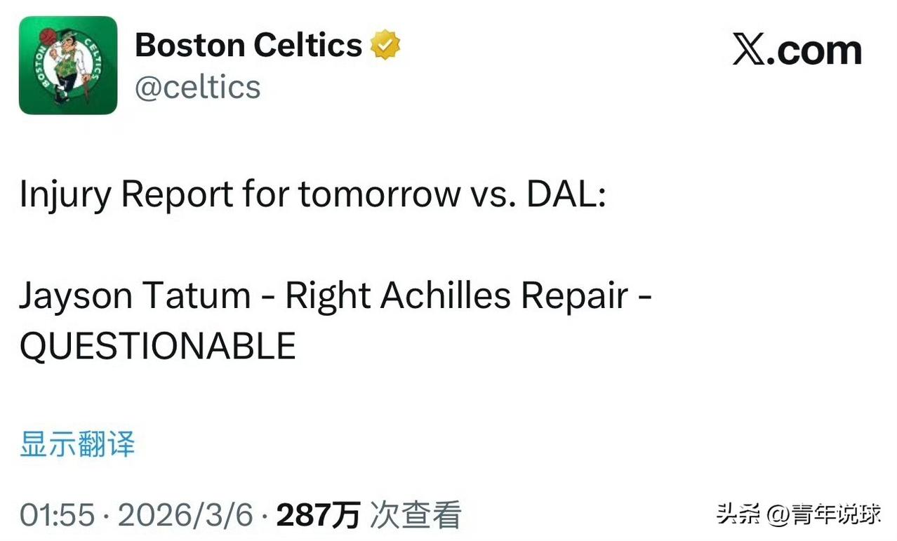 10个月不到!塔图姆有望明天复出! 今天,凯尔特人队官方更新了球队最新的伤病报告,报告中出现了一个久违的名字,那就是塔图姆,他的状态升级为了出战成疑,有望在明天对阵独行侠队的比赛中迎来复出。 值得一提的是,塔图姆从完成跟腱重伤修复手术到现在还不到10个月,他的恢复速度真是让人叹为观止。如今凯尔特人队战绩稳居东部前列,塔图姆肯定想早点复出尽快融入球队,然后在季后赛帮助球队冲出东部。本赛季的东部各队整体实力并不强,如果塔图姆能够有巅峰的8-9层能力,凯尔特人队或许真有希望在东部杀出重围!