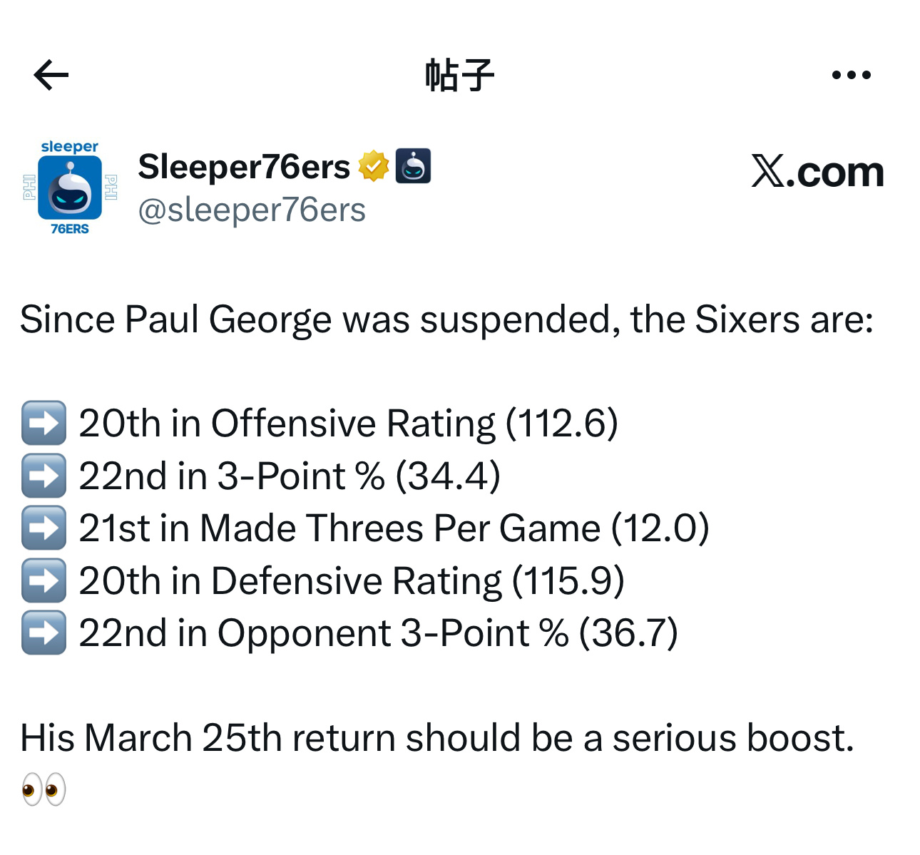 费城媒体Sleeper76ers发文表示,自从保罗·乔治被禁赛以来,76人队的一些情况⬇️
