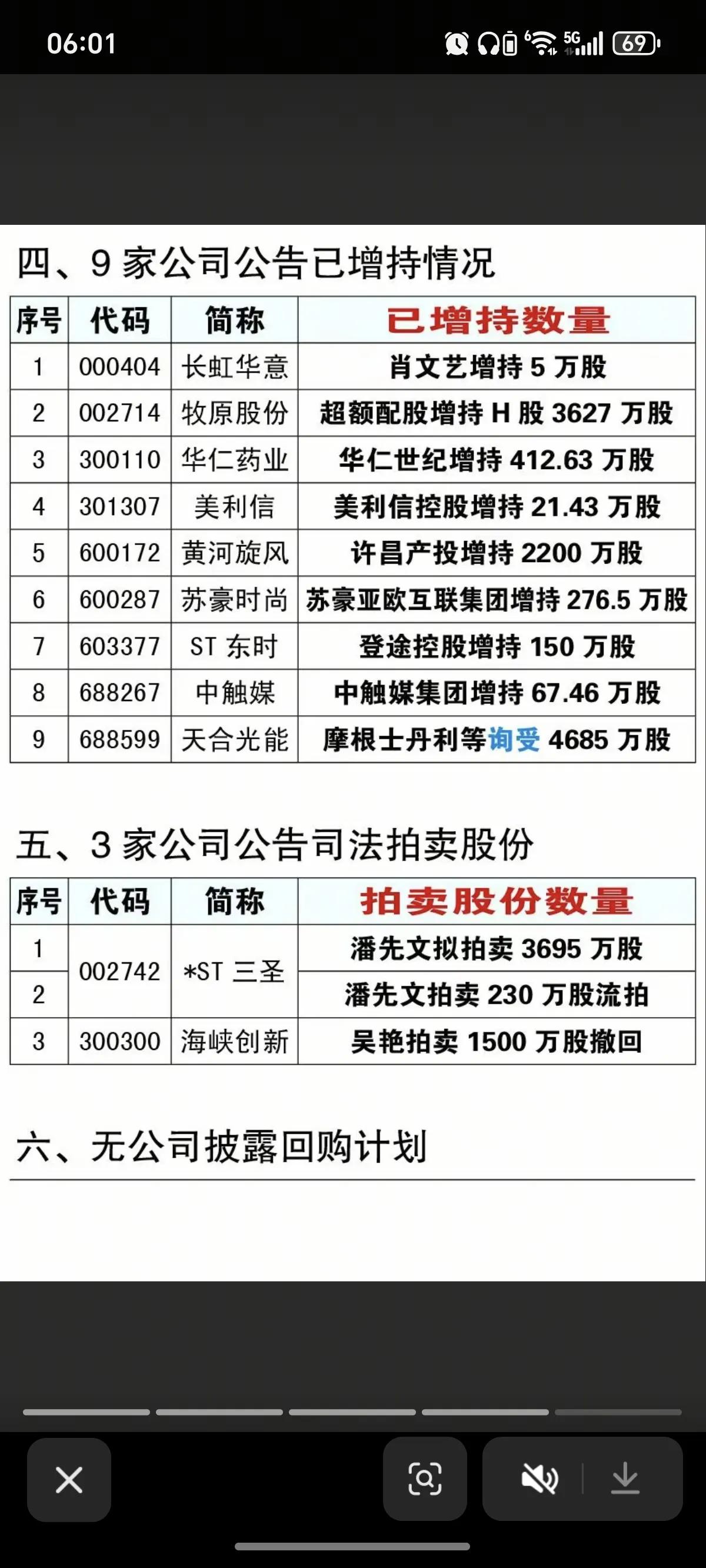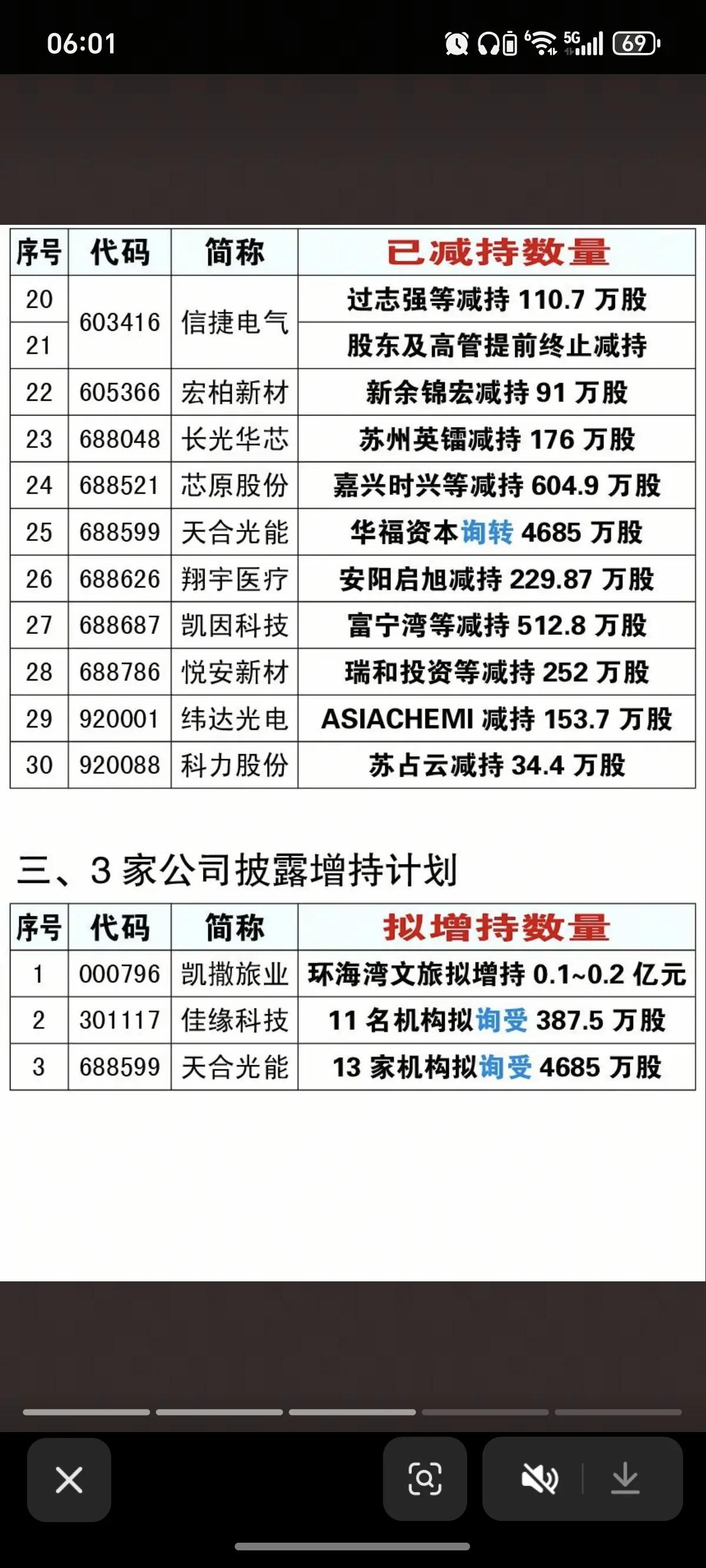 3月6日,周五A股盘前增减持与回购公告分析!!! 3月5日晚至6日早,A股增减持与回购公告密集披露,市场情绪呈现分化态势。 减持方面,15家股东披露减持计划,其中*ST三圣潘先文拟平仓3695万股,天合光能、佳缘科技等多股涉及大额减持或询转;30家股东已完成减持,好当家、陕西黑猫等减持规模较大,对相关个股形成短期压力。 增持方面,3家公司披露增持计划,凯撒旅业拟斥资0.1~0.2亿元增持,佳缘科技、天合光能获机构询受;9家公司已完成增持,黄河旋风、牧原股份等增持规模突出,释放积极信号。 回购方面,无新增回购计划,但4家公司披露回购进展,华菱钢铁等5家公司注销回购股份,彰显对长期价值的信心。整体来看,减持压力与增持回购形成对冲,需关注个股基本面与交易落地节奏!!!