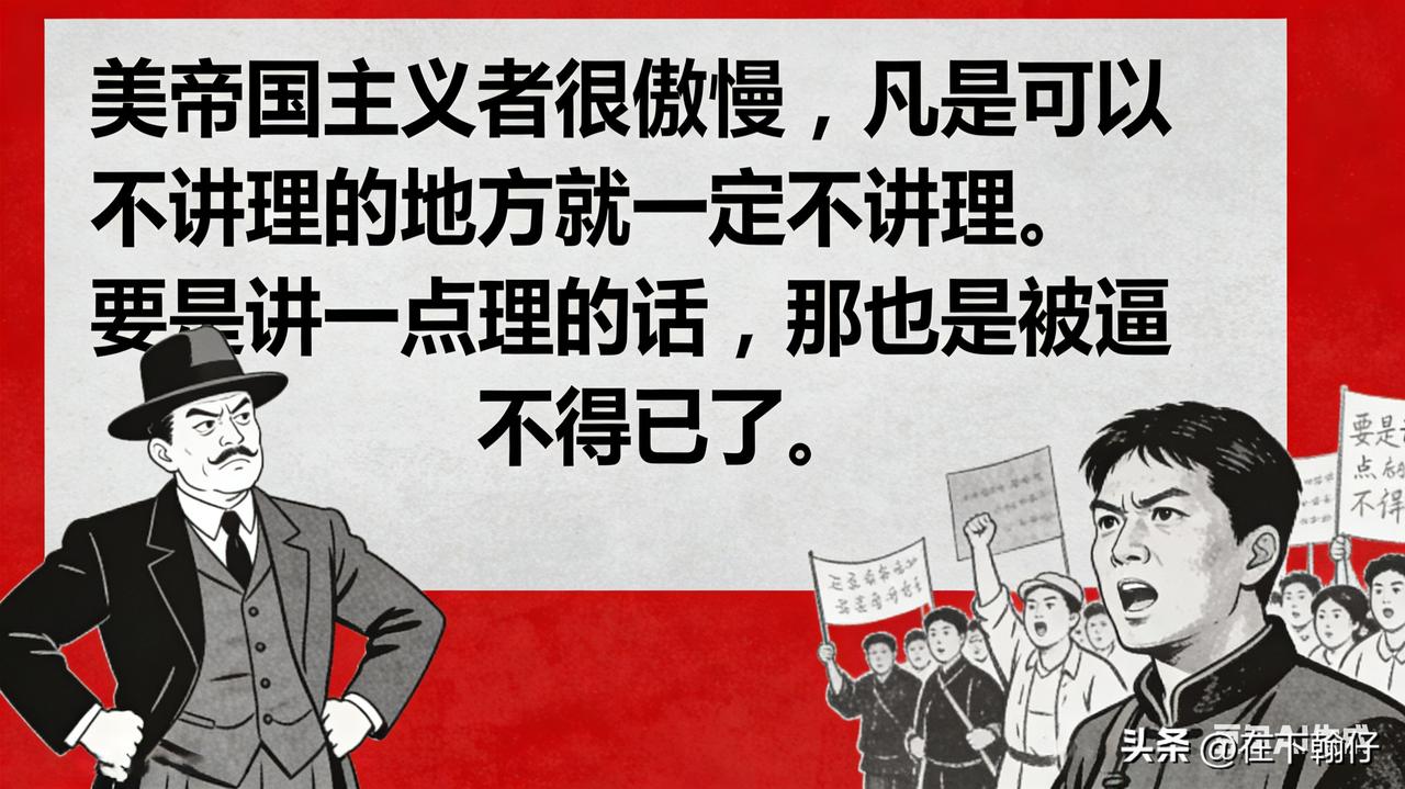 ”美帝国主义者很傲慢,凡是可以不讲理的地方就一定不讲理。要是讲一点理的话,那也是被逼不得已了。”——毛泽东 这句话出自毛泽东1953年9月12日在中央人民政府委员会第24次会议上的讲话《抗美援朝的伟大胜利和今后的任务》。这是他在总结抗美援朝战争停战谈判时的经典论断。 这句话不仅是对历史经验的总结,更是一种“以斗争求团结”的战略智慧。它强调:面对强权,必须保持清醒,既要看到其“傲慢”的本性,也要通过自身的强大和坚决的斗争,迫使对方回到平等的对话轨道上来。