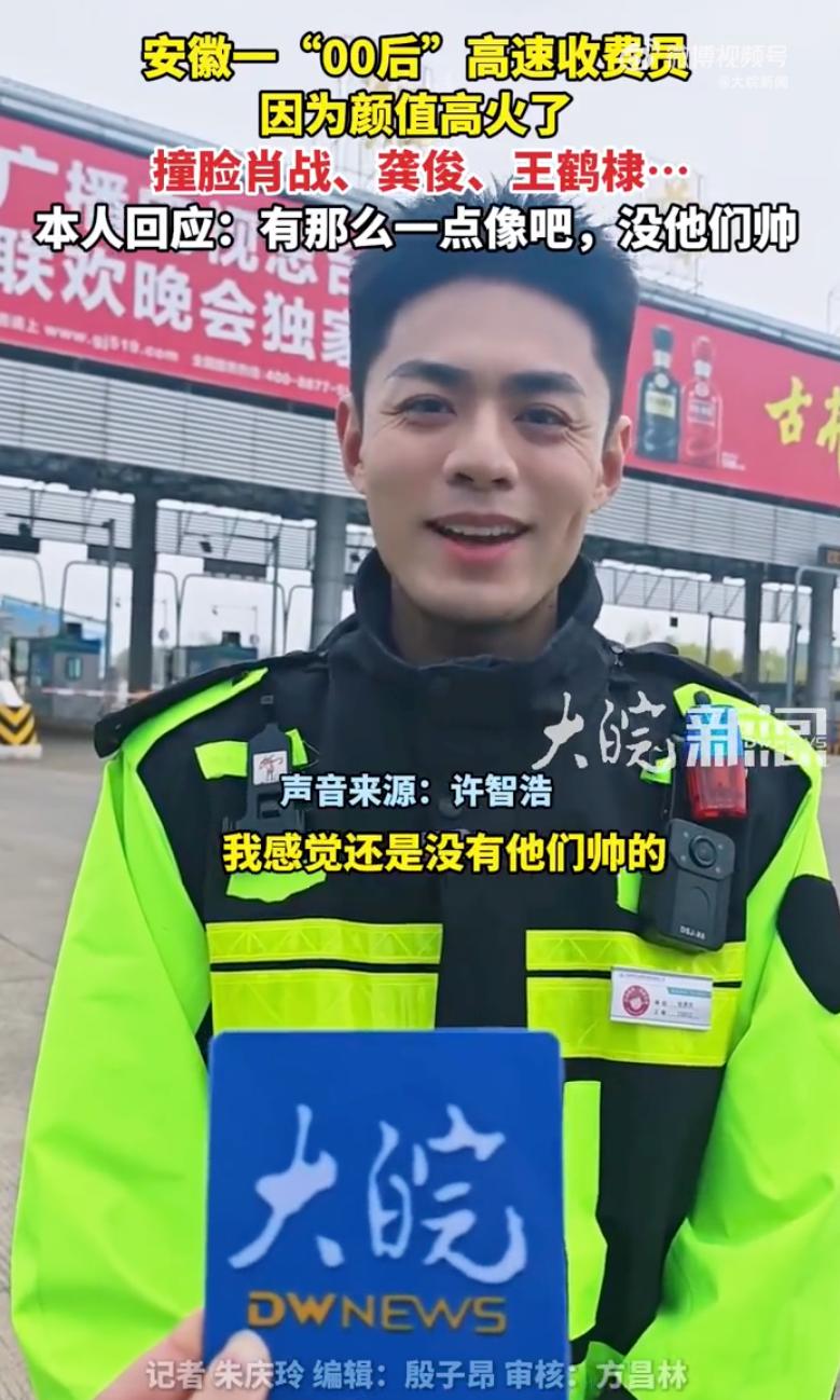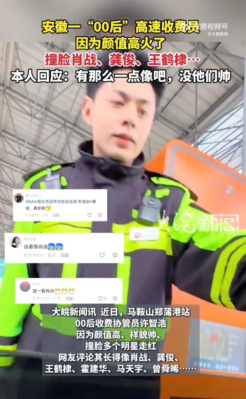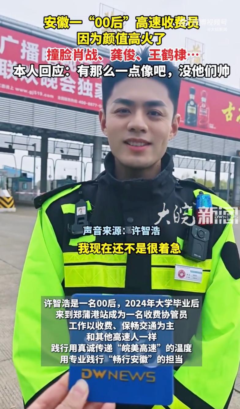 这下全国人民都知道了,这位小伙火了!安徽马鞍山,郑蒲港收费站有个00后收费员,因为长了一张“明星脸”彻底藏不住了。网友调侃:长得好看不仅要交给国家,还得接受网络通报! 这帅哥叫许智浩,巢湖人,去年刚从芜湖读完大学,个头足有192cm,往那一站就是个活脱脱的模特架子。 视频里他穿着那身藏青色制服,肩膀上挂着对讲机,胸口别着执法仪,虽然穿得厚实,但那股子英气根本挡不住。 细看那张脸,眉毛是浓密的野生剑眉,鼻梁高挺笔直,最抓人的是他笑起来时,脸颊上那俩酒窝深得能醉人。 这种硬朗轮廓配上甜滋滋的酒窝,简直是霍建华、肖战和王鹤棣的结合体,既有正气又不失少年感。 过路车主看呆了,随手一拍发到网上,直接几百万点击,全网都在问:这到底是哪个收费口?我现在就去安徽办点事! 3月5号下午,大皖新闻记者跑去现场实地打探。 当时往来车辆不少,许智浩正站在橘红色的机器旁忙活,收钱、保畅、指路,动作干脆利索。 提起走红这事,小伙挺不好意思,笑着说觉得自己没明星帅,网友这么一夸,他反而觉得身上压了担子,生怕做不好。 这几天确实有司乘人员特意找他合影搭讪,但他还是跟往常一样正常换班,没觉得自己成了红人就有什么了不得。 现场实测过的姐妹都激动坏了,说本人比视频里还要帅得扎眼。 不仅是个子高、模样好,最关键是那份微笑服务的劲儿,透着安徽高速人的阳光和热络。 不得不说,长得确实帅,现在网友真的是有一双发现美的眼睛,这样的帅哥也是可遇不可求。 这下好了,他彻底火了,还登上了热搜,成为了安徽高速上一道靓丽的风景线。 不过这人一火,打卡的人就多了,咱也得提个醒,稀罕归稀罕,可千万别为了看帅哥就扰乱人家的正常工作。 好看的皮囊是上天给的运气,但那份真诚专业的服务态度,才是最硬的职业标签。 生活里的美到处都有,能把平凡的岗位守出色彩,这才是真的牛。