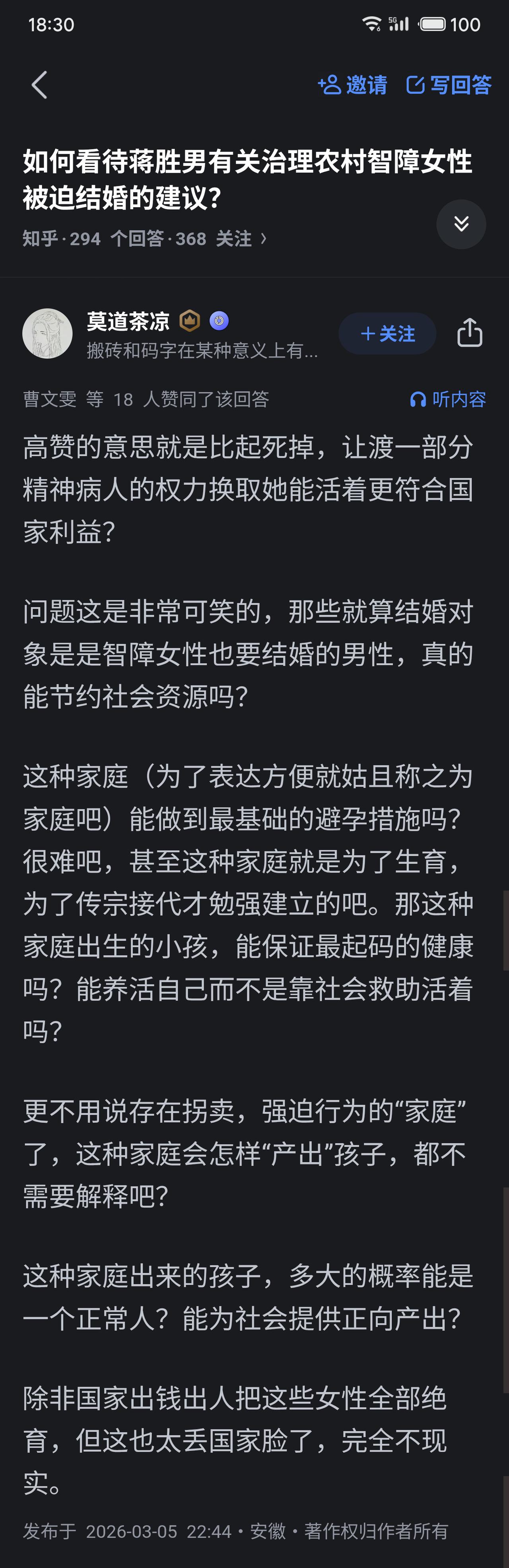 如何看待蒋胜男有关治理农村智障女性被迫结婚的建议? 全国政协委员蒋胜男在接受中国新闻周刊采访时指出,农村适婚人口性别比例失衡问题突出,部分地区还存在着买婚、收买精神障碍、智力障碍(合称“精智障”)女性为“妻”等强迫婚姻现象,建议推动农村精智障女性强迫婚姻治理行动及监护预警等机制。 蒋胜男表示,农村精智障女性强迫婚姻问题面临多重治理难题:婚姻自主决策支持缺失,婚姻登记要求监护人同意,忽视当事人真实意愿和决策能力评估,缺乏针对性婚前辅导;部分父母借“嫁女”牟利、转嫁照护责任,高额彩礼催生买卖行为,相关法律惩处机制不完善,侵权成本低;对流浪精智障女性救助不及时,法定报告义务缺乏强制力和配套机制;对未涉金钱交易的“收留”行为,法律责任界定模糊,取证难、定罪难。 为此,蒋胜男建议,开展为期一年的农村精智障女性强迫婚姻专项治理行动,覆盖预防教育、发现解救、安置康复、司法救济全环节;设立强迫婚姻危机干预中心和举报热线,接受匿名举报;建立联合强制报告机制,公职监护预警联动,保障当事人婚姻自主权利;完善法律法规体系,明确法律责任与民事救济途径。 ------------------------------------ 所以还是要搞