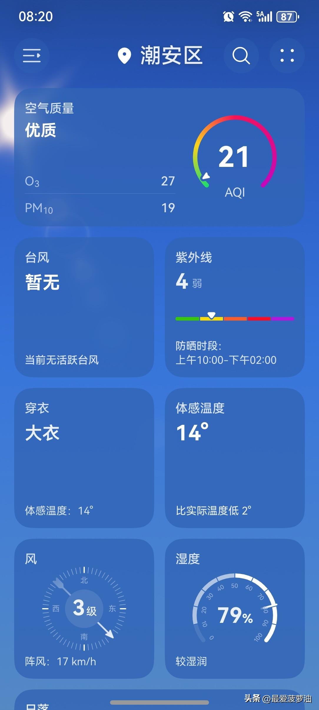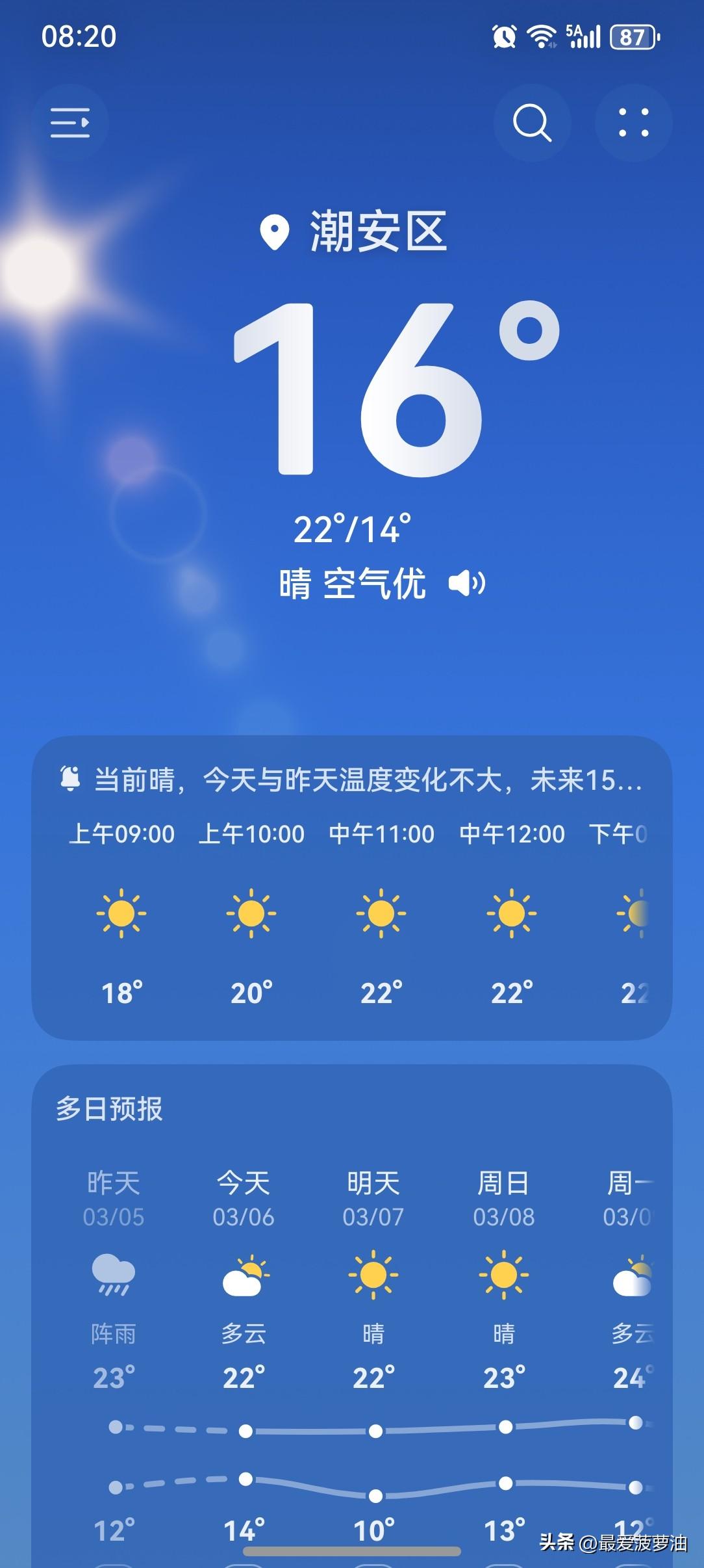 阳光回归!广东人终于把流浪的太阳盼回来了! 6~8日,受高压脊影响,广东大部分市县云量明显减少,以晴到多云为主,气温日较差增大。 今天(6日),潮州喜提一个多云天气,气温14~22℃,此刻气温16℃,体感温度14℃。 清晨六点,当太阳还没上线时,气温仍然有点低迷。早上的风也有点大,因此体感更凉了许多。不过,随着阳光的强势登场,气温已经开始有所上升了。 一起来看看今天的天空吧!已经很多天早上没有看到这么大这么耀眼的太阳了,此刻阳光灿烂,温柔而缓慢地洒满了大地,增添了几分鲜活的能量,让春天显得更加生机勃勃! 今天的天气,不管是从气温还是天色来讲,都是超给力的一天!这天气,凭实力获得一个五星好评! 如此天气!元芳,你怎么看? [我想静静][大笑][笑哭][捂脸][我想静静][大笑][笑哭][捂脸]