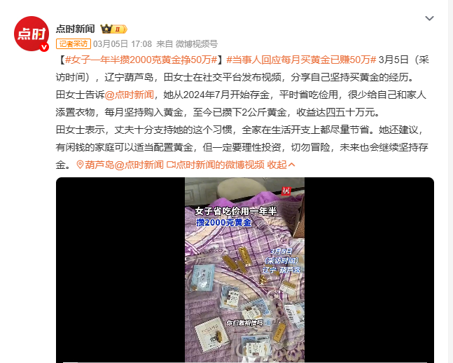 女子一年半攒2000克黄金挣50万当事人回应每月买黄金已赚50万 3月5日葫芦岛田女士晒存金历程,自2024年7月起省吃俭用每月买金,攒下2公斤黄金,收益四五十万。丈夫支持全家共省,她提醒闲钱家庭理性投资黄金,自己会持续存金。