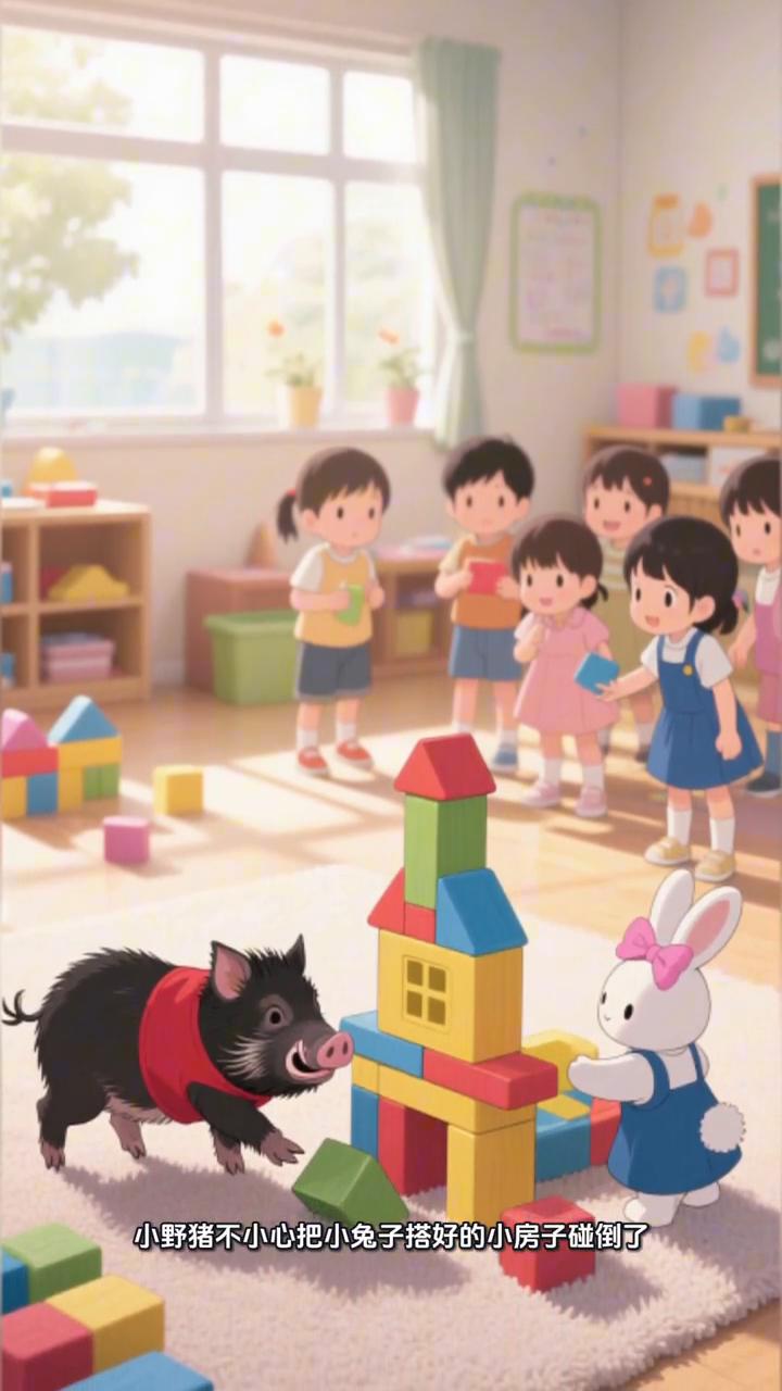 消失的精灵。 森林幼儿园里每个小朋友身边都住着一只小小的透明的守护精灵,只有心地诚实、善良友爱的小朋友才能留住自己的精灵。小野猪的精灵软软的、亮亮的,每天都陪在他身边。 有一天幼儿园里搭积木比赛,小野猪不小心把小兔子搭好的小房子碰倒了,他害怕被老师批评就撒了谎,大声说是小兔子自己弄倒的,是她捣乱。旁边的小刺猬和小狐狸听见了都以为是小兔子的错,大家不和小兔子玩,还对着小兔子指指点点。小兔子难过地缩在角落里眼睛红红的。 就在这时小野猪身边的守护精灵轻轻地叹了一口气,它的光一点点暗下去,一点点变小最后消失不见了。小野猪一下子觉得心里空空的、冷飕飕的,他看着委屈的小兔子终于想起明明是自己犯了错,他越想越内疚,小脑袋低低的,眼泪都快掉下来了。 第二天一早小野猪鼓起勇气走到小兔子面前,大声说:小兔子对不起,昨天是我碰倒了你的积木,是我撒了谎让你受委屈了,请你原谅我好不好?说完他又向小刺猬、小狐狸说了实话,承认了自己的错误。小兔子看着真诚的小野猪笑着点了点头:我原谅你啦。 就在原谅的那一刻,一道暖暖的光飘了过来,消失的精灵又回来了。它重新落在小野猪的肩膀上,亮亮的、暖暖的,比以前更可爱了。从此小野猪再也不撒谎了,他和小兔子、小刺猬、小狐狸成了最好的朋友,每天都开开心心地在一起。