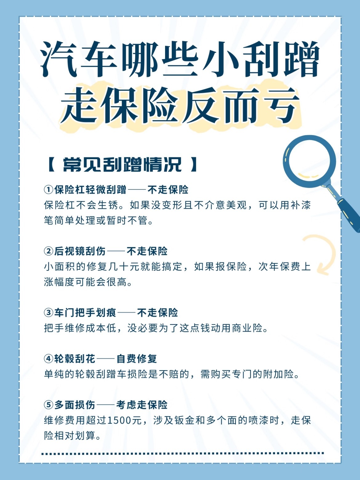 宝子门!爱车有小刮蹭想走保险?先算算这笔账!简单来说,当维修费用低于保费上涨的幅度时,走保险就是亏的。👇🏻这些情况不建议出险1️⃣保险杠轻微划痕:塑料件不生锈,局部喷漆100-300搞定。2️⃣后视镜小划痕:外面喷漆50-100,贴改色膜更便宜。3️⃣门把手划痕:100-200元修复。4️⃣轮毂蹭马路牙子:100-300拉丝修复。5️⃣保险杠轻微开裂:塑焊+喷漆200-400。✅这些情况果断走保险:🔸多处损伤:3个面以上,维修费1500+🔸涉及人伤:交强险处理,别私了🔸撞了豪车:对方修车费分分钟五位数多年未出险的老司机注意!一次小理赔可能让你损失好几千的折扣,远不如自费划算哦~我与汽车的日常大v聊车