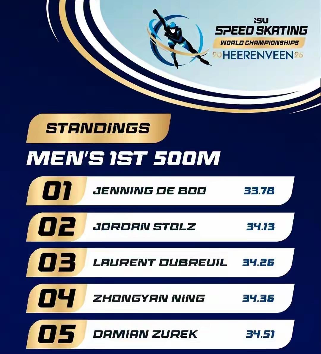 明天凌晨宁忠岩冲击世界冠军! 2026年速度滑冰短距离和全能世锦赛在荷兰海伦芬结束了第一天的争夺,中国奥运冠军宁忠岩率先登场亮相,在率先进行的500米一赛中,宁忠岩滑出34.36秒的成绩,位列赛事第4名;随后进行的1000米一赛中,宁忠岩延续平稳的竞技状态,以1:07.61的成绩完赛,同样位列赛事第4名。 目前短距离全能积分榜前三名分别是詹宁·德·布、乔丹·斯托尔兹和宁忠岩。 明日凌晨,将进行500米和1000米二赛,宁忠岩将向冠军发起冲击。