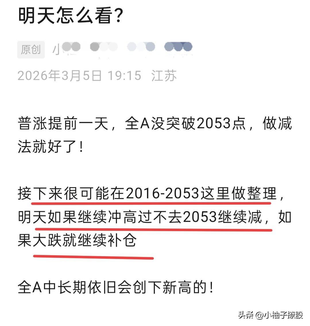今天继续看全A2053这个压力位,今天它能不能成功站稳这里,以目前的量能来说,今天很大概率站不稳! 没什么要说的,不要跳来跳去,只要是大趋势,波段票,都可以安心卧倒,全A后面会继续创下新高,如果你跳来跳去,很可能错过大几十个点的涨幅! 短线会继续波动,来回震荡,接下来的两天很可能就要开始进行二次探底了,就看你是什么心态了! 慢牛依旧健在,不要怕!! 就这样吧!