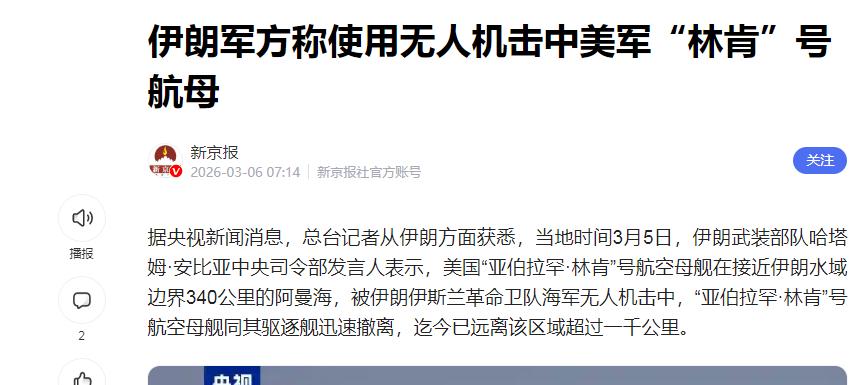 终于打到航母了,美国的航母就是美国战争的脸面,是不能碰的,一旦碰着了,美军恐将军心涣散。 没看错,是那个以往只会出现在好莱坞电影里的场景,真真实实落到了现实。 这个消息出来,瞬间吸睛无数。 要知道,这可是美军航母,全世界绝大多数国家都只能远远看着的超级装备。 平常刷抖音一堆“航母有多强”的视频,弹幕全是“航母无敌”“谁都不能碰”,这次直接来了现实反转。 按伊朗哈塔姆・安比亚中央司令部的说法,事发地离伊朗水域边界只有340公里。 伊斯兰革命卫队海军操控无人机完成了这个动作,这种象征意义一下子拉满。 很多网友关心打中了哪里,有没有出现重大损伤。 其实根据多方公开资料,目前并没有美方自己公布具体伤亡什么的,但是美国航母加上护航驱逐舰果断撤离,已经跑出上千公里,足见事情的影响。 众所周知,美航母一直都是“威慑行动”的代名词,这样的象征性平台遭到打击,哪怕目前影响没有详细披露,美方马上大幅后撤,心理影响不小。 很多人问,这次为什么伊朗敢做得这么直接? 细细一想,其实也不是一时冲动。 伊朗这些年在无人机作战领域确实进步明显,外界对他们的不重视、轻慢甚至带有偏见,但这次事件刚好让世界正视:在现代战争舞台上,中东国家同样能突破美科技包围圈,打出“擦边球”。 而且伊朗选择在阿曼海“精确点名”的地方出手,直面美航母,跟过往海湾擦枪走火完全不一样。 这背后,其实是伊朗对美军在中东活动日益强势的态度转变。 美国长年依赖重型高科技战争平台,伊朗则用低成本、难防范的小型无人机“钻空子”。 新型作战理念已经慢慢变革中,尤其是在区域局势日益复杂、各方实力不断变化的今天。 聊到这里,很多朋友要问:这一击之后,伊朗有没有后续动作准备?是不是还会有更大动作?事实很简单,如果一家伙敢正面打航母,后手肯定早就想好了。 技术方面,这次行动最大的意义,是证明伊朗不仅能摸到美国航母,更能精准命中。 彪悍的伊斯兰革命卫队还在持续展示更高科技装备,目前伊朗不光有无人机,还有弹道导弹,外媒普遍认为其弹道导弹的部分射程和命中精度早已能威胁在中东的美军大型基地。 所谓“饱和打击”也可以做到。你说空袭和导弹交替用,短期美军压力直线上升。 而美国在这一事件之后,也并不是无动于衷。 局势一紧张,美国立刻追加更多海空兵力往中东区域调集。 很多机构都注意到,美方在最近几天动作频繁,从战备巡航、保障油气通道安全到向盟友加强安全承诺。 更有意思的是,美国的作战时间规划也随局势不断更迭——从最早预判的“只打斩首空袭一周”,变成“至少打一周,撑一个月”,现在又进入“全力准备撑三个月”状态。 不仅要弹药补给,还追加地勤、情报、技术各类人才,对战略后勤物资严格查漏补缺。 当然,目前美国其实还相当谨慎。 虽然外部压力持续增大,但派遣地面部队这种“动真格”的选项还没推上台面。 曾有外媒披露,美军参谋本部多次评估过地面介入的利弊风险。 结果是权衡之下,仍选择维持以空中作战和海上威慑为主。 毕竟一旦地面部队下场,等于把冲突升级好几个层级,不仅后果不可控,而且极易导致区域格局剧变。 聊到这里,就不得不说到以色列的身影。 懂局势的一定看得出来,这次美伊紧张升级,其实以色列不可忽视。 某种意义上,以色列多年来一直推动美国对中东的深度介入。以色列无论在理念、政策还是行动上都施加了非常大的影响,从实际作战方案,到情报链路、口头鼓动再到国际舆论,都在拉美国入局。 也正因如此,美军这次作战计划一而再、再而三调整——从“高强度短平快”转向“持久战消耗”,从“有限打击”延长到“撑三个月”的长战线,这背后既有美国安全自身考量,也有以色列战略上的“推波助澜”。 再回看大盘,这场美伊冲突,直接带动了全球能源和金融市场的巨大波动。 油价一个劲儿往上涨,全球主要资本市场都对中东局势高度关注。 为什么?很简单,全球三分之一以上的原油贸易要经过波斯湾,阿曼、霍尔木兹海峡堪称咽喉要道。 中东有事,国际油价就要跟着坐过山车。从2020年以来,每一次波斯湾有大动作,都在油价曲线上留下痕迹。这种影响,远比单纯军事冲突更持久。 对我国来说,关注并稳妥应对全球能源价格波动,保障能源供应安全尤为重要。 我国高度重视与各国能源合作,坚持以平等、和平合作和互利共赢的外交理念,既不盲目站队,也不被外部极端势力左右,主张通过对话协商缓和局势,这才是根本保障长远发展的基石。 参考: 新京报——伊朗军方称使用无人机击中美军“林肯”号航母