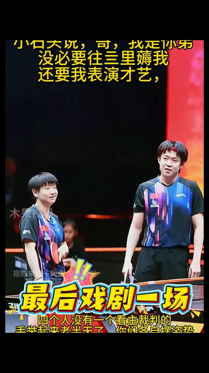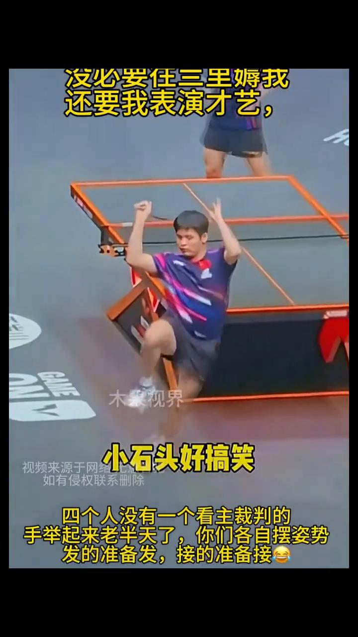 没必要往三里薅我,还要我表演才艺,一个拿毛巾挡着,一个借水瓶挡着。颧骨上扬的俩人一对视就笑场。四个人没有一个看主裁判的,手举起来老半天了,你们各自摆姿势。发的准备发,接的准备接。这俩活宝使劲憋住不笑,果然是快乐混双。混双内战,小石头好搞笑,莎头3比0拿下。最后戏剧一场,小石头的话把哥哥姐姐逗笑了。发的准备发,接的准备接。