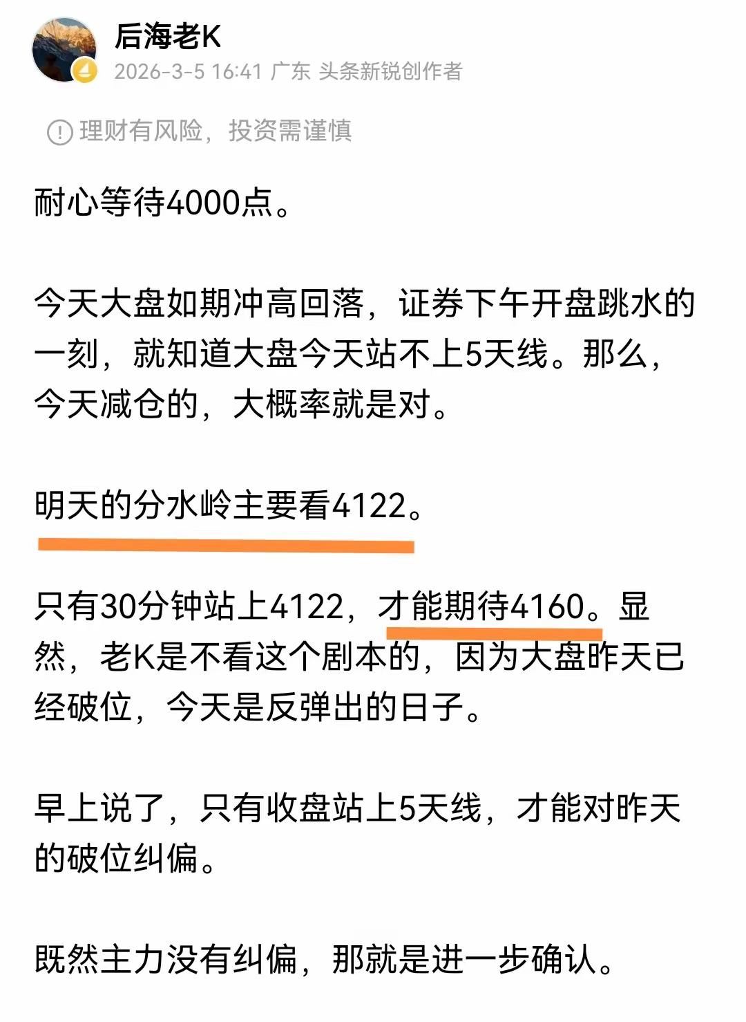 隔夜美股这一跌,道指直接砸了1.6%,纳指看着跌得不多,0.26%的跌幅里也藏着不少板块的动荡。一早起来看日韩股市,低开那下确实让人捏把汗,好在后面慢慢拉了回来,眼看就要翻红,这波“先抑后扬”倒有点意思。 回到咱们这边,今天大盘怎么走?昨天就跟大家划了线,4122是道坎。早上低开要是能拉起来,30分钟内站不稳这个数,大概率就得掉头往下;真站稳了,往上冲也别太乐观,4160那是个坎,破位后的反弹极限差不多就在这,到了这儿该减仓还得减,别犹豫。 有人说,盘后不是放了不少利好吗?这话没错,这些消息对稳住情绪肯定有用,早上开盘说不定能借点力。但要说凭这个就能把破位的颓势给扭过来,我觉得悬。全球市场现在都在往下靠,咱们大盘既然选择了跟着同步调整,哪能是几个短期利好就轻易拐头的?趋势这东西,一旦形成惯性,没那么容易急转弯。 尤其提醒那些已经轻仓的朋友,卖了就踏踏实实看着,别被盘中突然冒出来的拉升勾得手痒。有时候盘面会故意整个超预期的冲高,看着热闹,其实可能是个套。你想想,美股那边还在跌,全球资金都在收缩,咱们这儿想独善其身太难了。 说真的,现在这行情,比的不是谁赚得多,是谁能少亏、不犯错。4122和4160这两个数记牢了,操作起来心里就有谱。别管消息面怎么蹦跶,盯着这两个位置来,该等的等,该撤的撤,保住本金比啥都强。 要是今天真冲得挺猛,也别脑子一热就追。你看看那些前期涨得猛的板块,这几天回调多凶?市场现在就这德性,快涨快跌的背后,是资金在来回折腾。咱们小散户跟不上那个节奏,不如守好自己的规矩,不贪那点风险里的利润,才能在这波调整里站得稳。 总之,别盼着一下子反转,全球市场没给出信号前,稳住仓位比啥都重要。轻仓的就管住手,持仓的到了关键位置该动就动,别被“短期利好”迷了眼。行情再乱,守好自己的防线,比啥都靠谱。