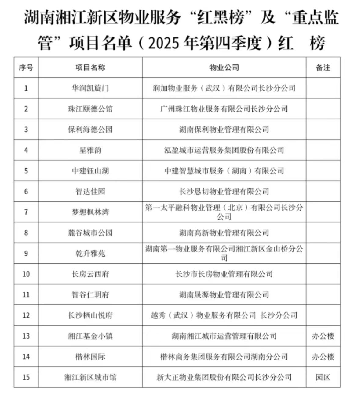 物业“红黑榜”更新!我家小区上了“重点监管”名单,整改能来真的吗? 上周看到社区群里的消息,心里咯噔一下——我们小区的物业,上了湘江新区第四季度的“重点监管”名单了。 前几天,湘江新区2025年第四季度的物业服务“红黑榜”正式发布了。和许多邻居一样,我第一时间就去翻看了那份名单。不出所料,我们的小区——新诚小区,果然出现在了“重点监管”那一栏。 说实话,心里有点复杂。既觉得“该!”,又担心,上了榜,到底有没有用? 那些上榜的“明星”小区,究竟什么样? 这次共有15个小区上了“红榜”,像华润凯旋门、珠江颐德公馆这些名字,在业主群里几乎是“别人家的小区”代名词。 邻居群里有人住在“红榜”小区,经常“凡尔赛”式吐槽——比如“我们管家回消息太快了,半夜11点发个信息问快递,秒回”、“楼栋大堂的绿植每周都换,物业费感觉没白交”。 再看看我们小区。楼道灯坏了报修,拖了一周才有人来看;地下车库的监控坏了几个月,物业说“配件在采购中”;外来车辆随意进出,保安基本不闻不问……这些“日常”的糟心事,恐怕就是登上“重点监管”的原因。 被“重点监管”,到底意味着什么? 名单里,像我们小区这样被“黄牌警告”的,一共10个。文件说,主管部门要高频次检查、找物业公司“一把手”谈话、定下整改时间表。 作为业主,我们最关心的是:谈话之后呢?整改能落到实处吗? 是继续“头痛医头、脚痛医脚”,做点表面功夫应付检查,还是能真刀真枪地解决我们反馈了无数遍的老大难问题? 那5个上“黑榜”的小区,业主该怎么办? 这次最严厉的是5个“黑榜”小区,包括爱晚花园、新天地等。这意味着物业公司不仅被公开曝光,还可能被限制接新项目、取消评优资格。 看到这里,我们“重点监管”小区的业主反而有点庆幸——至少还没到最差的那一步,还有整改的机会。但“黑榜”小区的业主们,此刻恐怕更焦虑:物业会被更换吗?新来的会更好吗?中间的混乱期谁来负责? 一点心里话:榜单之外,我们真正要什么? 这份榜单,至少是一个开始。它用官方的方式告诉所有物业公司:做得好,有人夸;做得差,有人管。也告诉我们业主:你的不满意,是被看见的。 但我们想要的,从来不是一张榜单。我们想要的很简单:回家时灯是亮的,车有地方停且安全,公共区域是干净的,问题反馈是有人理且能解决的。 物业费交得明白,服务看得见摸得着。 希望这次“重点监管”不是一阵风。希望下个季度,我们小区能从“需整改”的名单里消失,或者,更进一步。 你的小区在榜上吗?你对物业有什么想吐槽或表扬的? 一起来评论区聊聊吧,或许我们的声音,能让改变来得更快一点。
